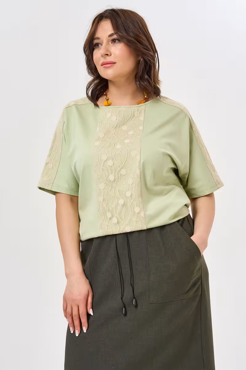 Эта блузка доказывает что элегантность кроется в деталях. Кружевные вставки словно нежные узоры рисуют линии на плечах и груди создавая романтический акцент в строгом силуэте. Мягкий трикотаж дарит свободу движений и комфорт даже в самый насыщенный день.Рукава до локтя – идеальная длина для межсезонья когда хочется выглядеть профессионально не жертвуя комфортом. Округлый вырез подчеркивает линию шеи а небольшие разрезы по бокам добавляют динамики классическому крою.Оттенок зеленого освежает любой гардероб и прекрасно сочетается как с брюками-карандашом для деловых встреч так и с джинсами для weekend образов. С юбкой создает женственный лук для свиданий или дружеских встреч.Трикотажная основа обеспечивает практичность – блузка не мнется и сохраняет форму после стирки. Кружевные детали превращают базовую вещь в statement piece который работает от офиса до вечеринки.
