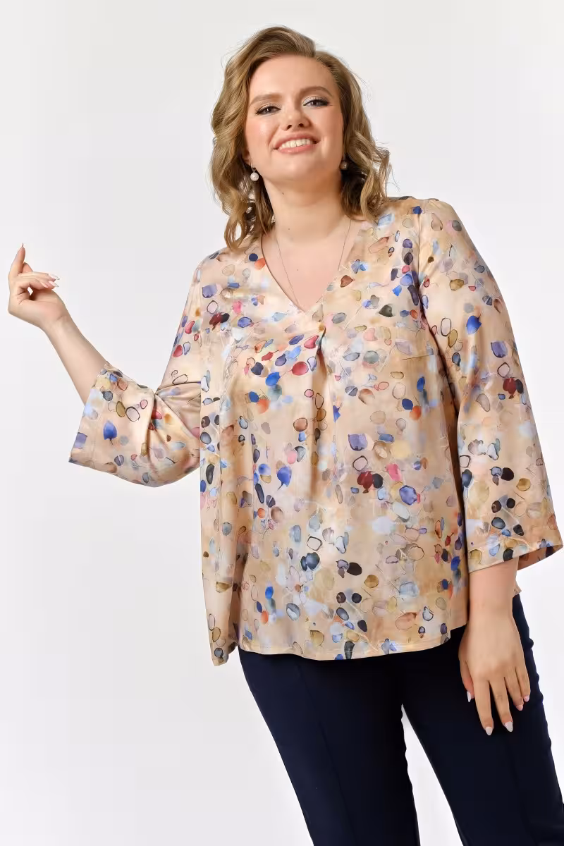 Блузка с мягко расширяющимся к низу силуэтом создает невесомое ощущение движения. V-образный вырез визуально удлиняет шею и подчеркивает декольте. Нежные складки на груди добавляют объем и женственность образу.