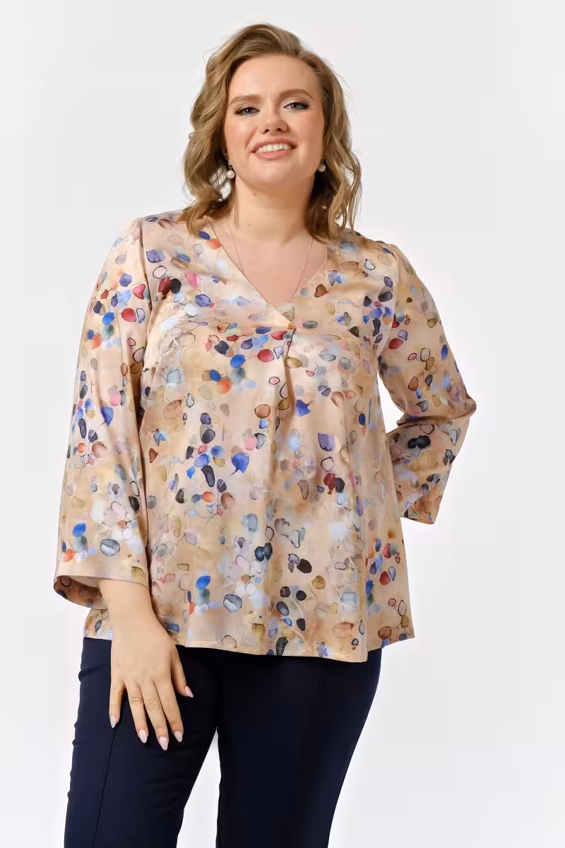 Эта блузка станет основой для множества стильных комбинаций благодаря своему продуманному крою. Расклешенный силуэт мягко скрывает особенности фигуры создавая элегантную линию от плеч к бедрам. V-образный вырез открывает зону декольте визуально вытягивает силуэт и подходит для любого типа фигуры.Мягкие складки на груди создают красивую драпировку которая добавляет женственности даже самому строгому образу. Деликатные вытачки формируют аккуратную посадку по фигуре без лишнего облегания.Легкая ткань с цветочным принтом делает блузку универсальной для разных occasions. В паре с прямыми брюками высокой посадки получается элегантный офисный look. С зауженными джинсами блузка создает непринужденный casual образ для прогулок и встреч с друзьями.Свободный крой обеспечивает комфорт в движении а изящный силуэт подходит для деловых встреч и вечерних выходов. Блузка легко сочетается с жакетами кардиганами и аксессуарами позволяя создавать образы на любой случай жизни.