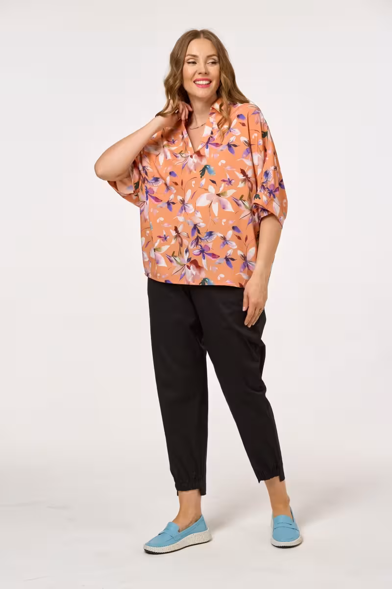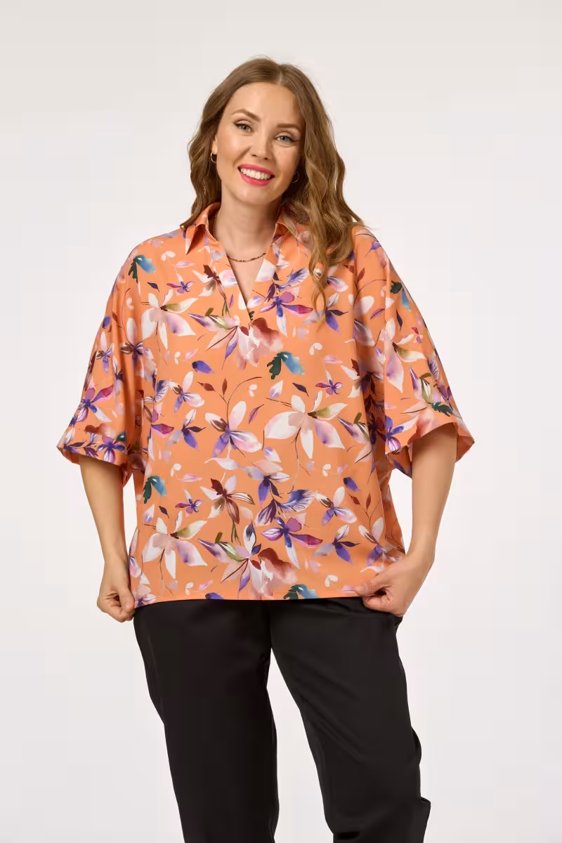 Эта блузка дарит то самое ощущение легкости когда хочется двигаться без ограничений. Свободный крой и рукава до локтя создают непринужденный образ для прогулок по городу или встреч в любимом кафе.