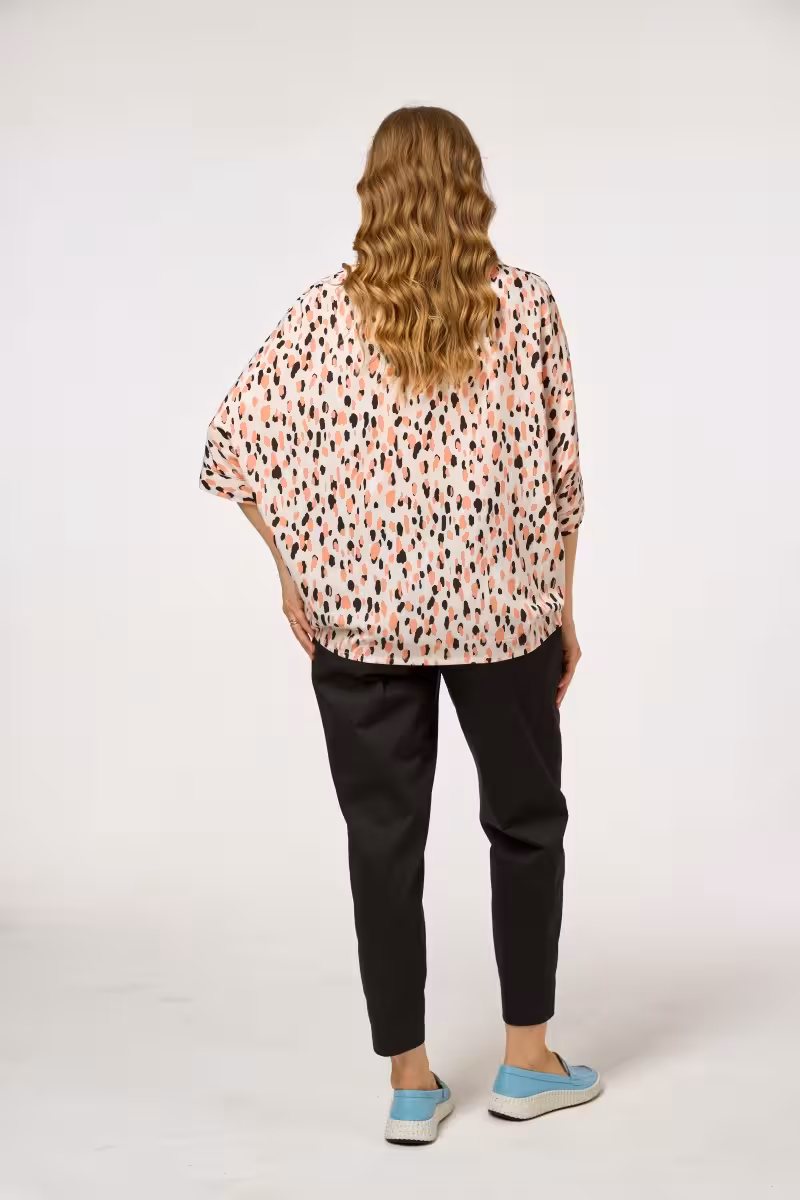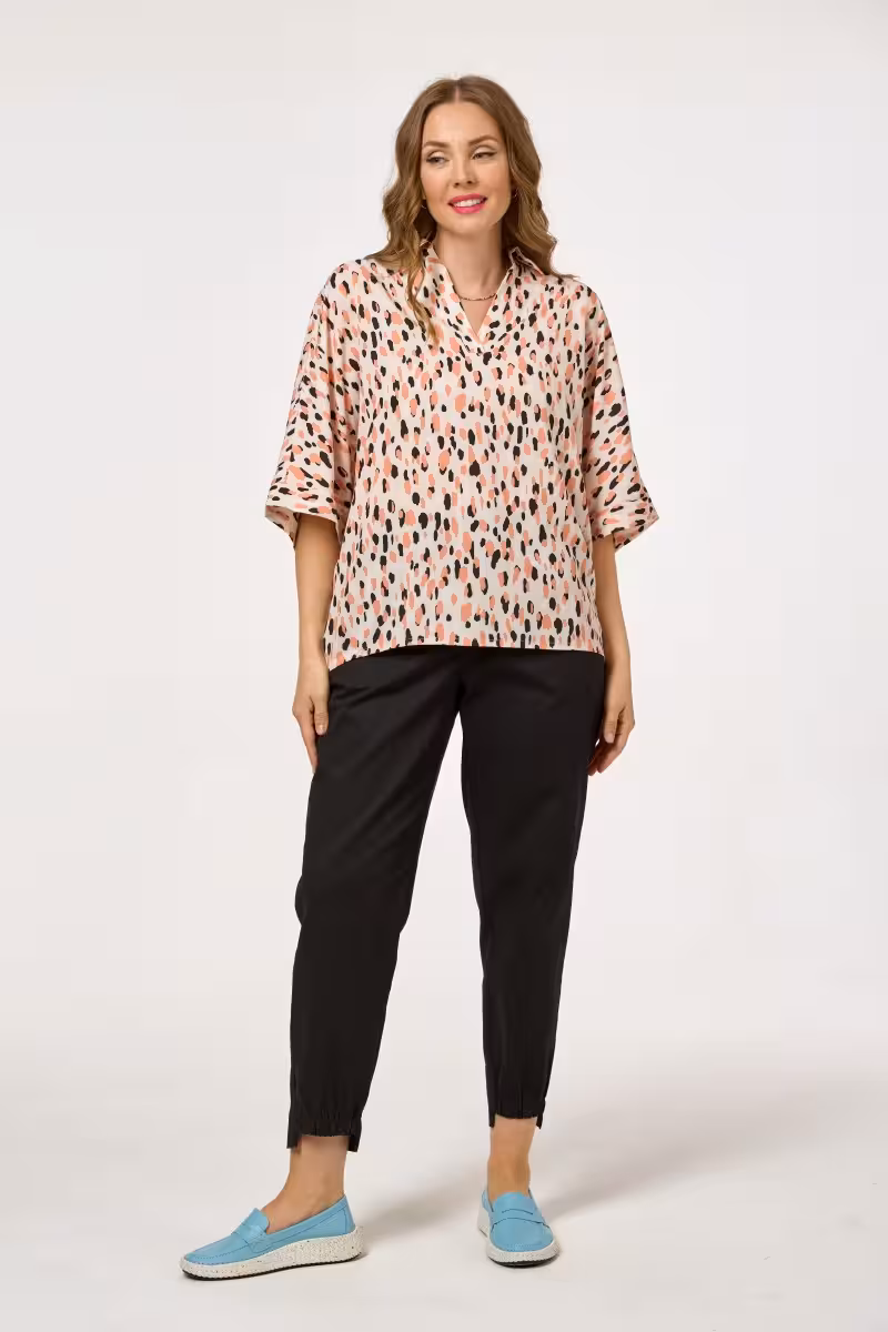 Свободная блузка с игривым принтом дарит ощущение легкости и непринужденности. Рукава три четверти создают элегантную линию а воздушный силуэт позволяет чувствовать себя комфортно весь день.