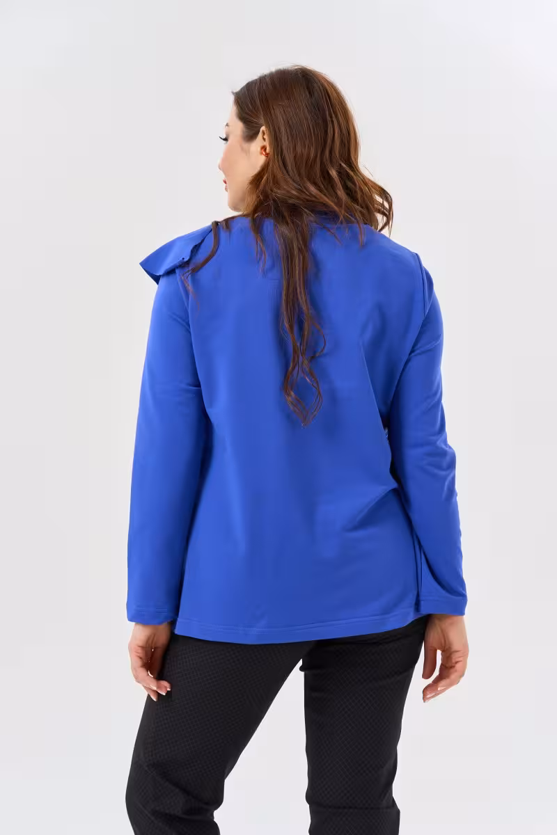 Синяя блузка с роскошным воланом спереди добавляет образу театральности и женственности. Свободный силуэт дарит комфорт в движении а яркий цвет поднимает настроение даже в самый обычный день.