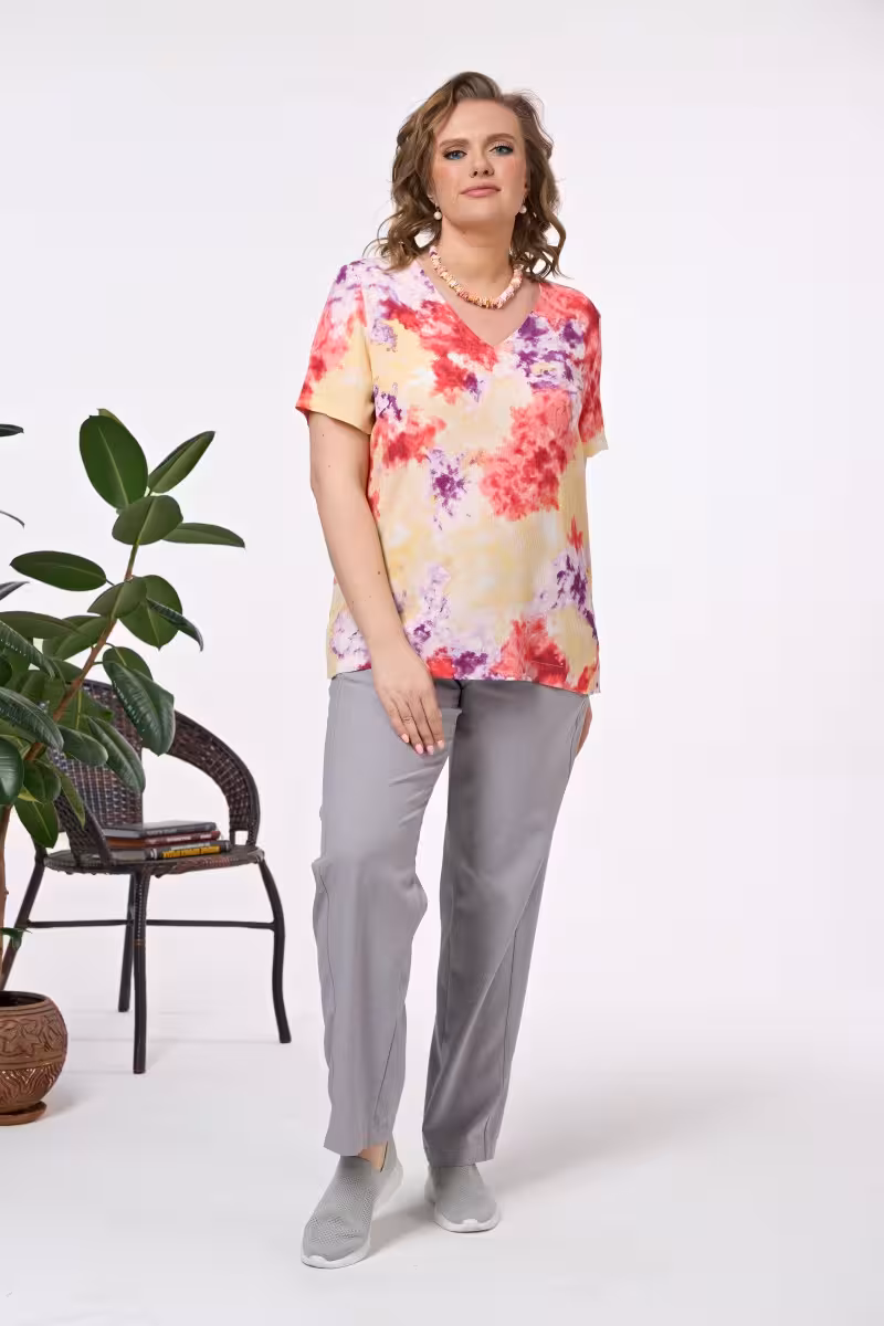 Эта блузка станет ярким акцентом в гардеробе благодаря необычному акварельному принту в розово-фиолетовой гамме. Прямой силуэт не сковывает движения а V-образный вырез красиво обрамляет декольте и визуально удлиняет шею. Короткие рукава создают легкий непринужденный образ идеальный для теплого сезона.Мягкая вискоза приятна к телу и отлично драпируется создавая естественные складки. Материал дышит и не сковывает движения даже в самый жаркий день. Боковые разрезы по низу добавляют модели современности и делают ее еще более комфортной.Блузка прекрасно сочетается с деловыми прямыми брюками для офиса – яркий принт оживит строгий дресс-код. С зауженными брюками получится элегантный образ для вечернего выхода. Для прогулок и путешествий можно комбинировать с джинсами или свободными брюками-бананами.Модель подходит для деловых встреч где хочется проявить индивидуальность летних вечеринок и романтических свиданий. Универсальная длина позволяет носить блузку заправленной или навыпуск создавая разные по наст