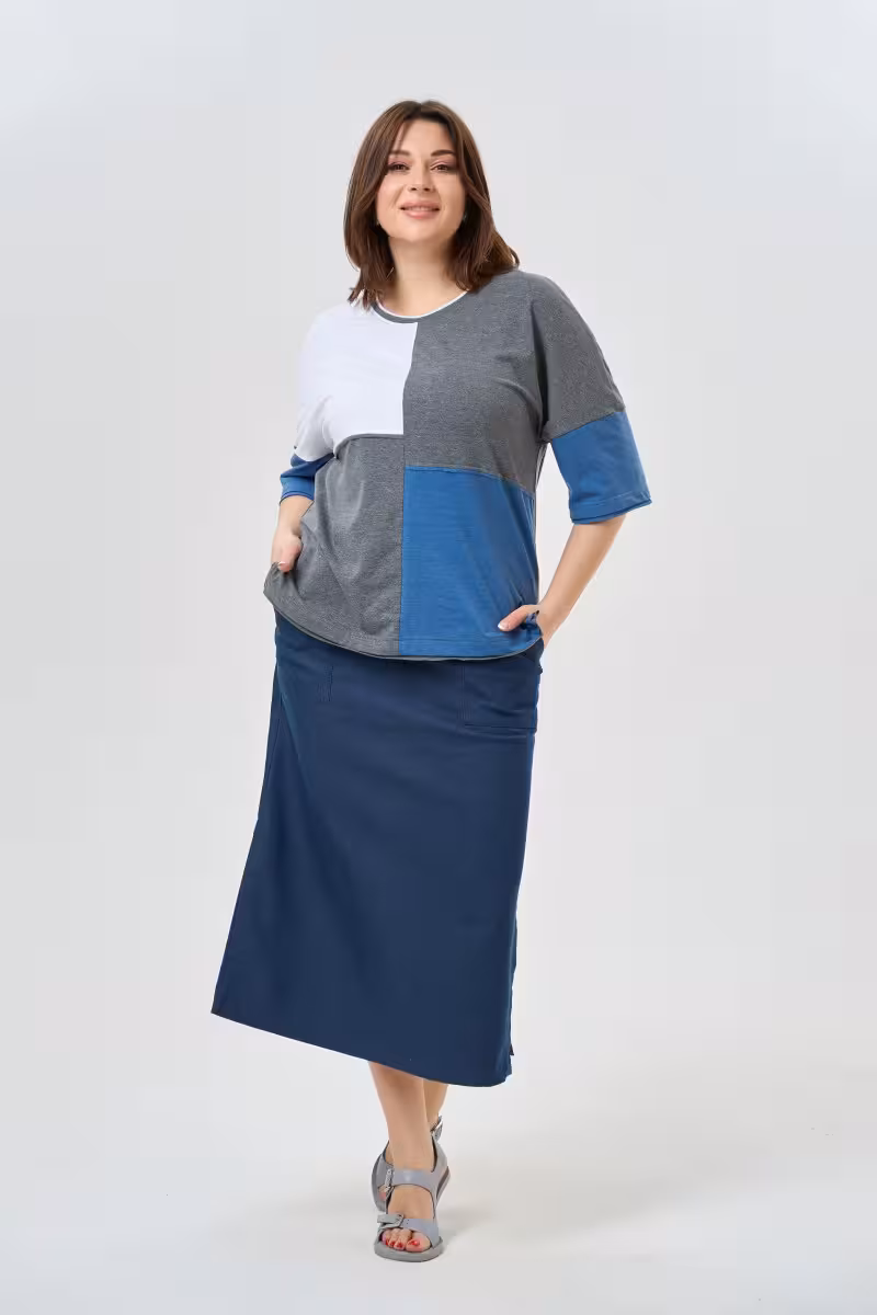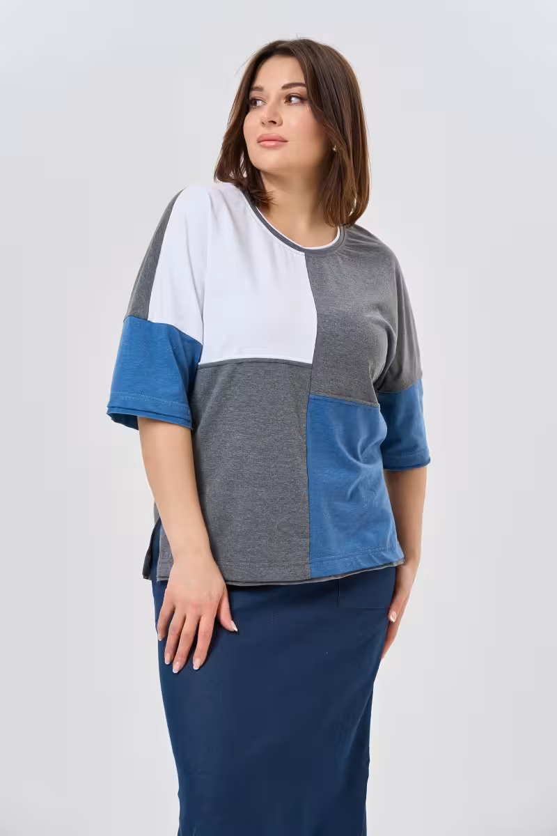 Блузка в технике цветных блоков – тренд который никогда не выходит из моды. Сочетание белого серого и синего создает гармоничную палитру которая легко вписывается в любой гардероб. Округлый вырез горловины подчеркивает изящество линии шеи а продуманная отделка краев добавляет аккуратности силуэту.Мягкий трикотаж приятно прилегает к телу не сковывая движений. Разрезы по бокам делают посадку еще более комфортной и добавляют современности крою. Блузка отлично сочетается с прямыми брюками для делового образа или с джинсами для weekend настроения.Геометричный принт из цветных блоков визуально стройнит фигуру и создает интересную игру линий. Это идеальный выбор для офиса деловой встречи или прогулки по городу. Длина до бедер универсально подходит к разным типам низа – от зауженных брюк до юбки-карандаш.Трикотажная основа обеспечивает практичность в уходе и долговечность формы после стирок.