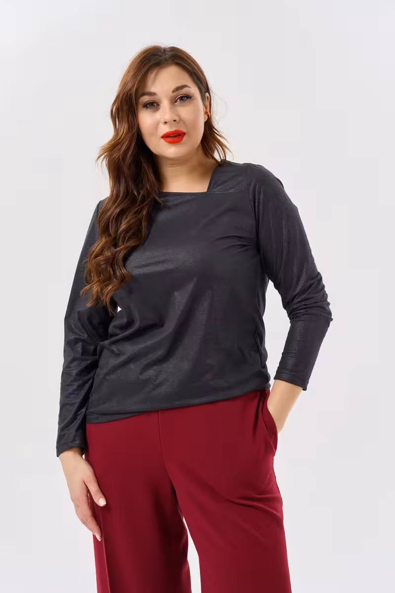 Черная блузка из мягкого трикотажа становится основой для самых разных образов. Полуприлегающий силуэт красиво подчеркивает фигуру не сковывая движения. Главная изюминка модели – асимметричная деталь на левом плече которая превращает простую вещь в дизайнерскую находку.Фигурный вырез горловины создает женственную линию декольте а длинные рукава добавляют элегантности. Тонкий трикотаж приятен к телу и не мнется в течение дня что особенно важно для активного ритма жизни.В офисе эта блузка составит идеальную пару с прямыми брюками и жакетом. Для деловой встречи можно дополнить образ зауженными брюками. На вечеринку стоит надеть ее с палаццо или юбкой. Для прогулки подойдут брюки-бананы или любимые джинсы.Универсальный черный цвет легко сочетается с любыми оттенками и принтами. Эта блузка одинаково хорошо смотрится с яркими аксессуарами и в минималистичном образе. Качественный трикотаж сохраняет форму после стирки и носки долгое время.