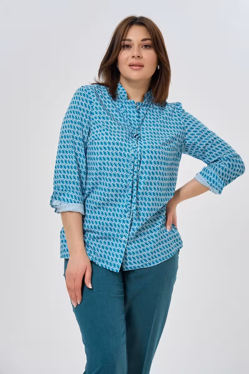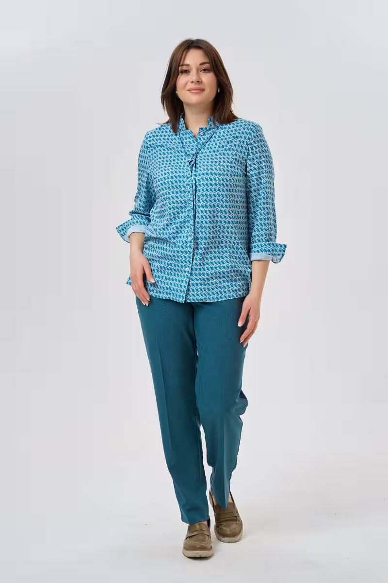 Эта голубая блузка словно создана для современных женщин которые ценят баланс между элегантностью и комфортом. Воротник-стойка с завязкой добавляет образу особую утонченность – можно носить завязанным для романтичного настроения или распущенным для более расслабленного стиля.Прямой силуэт не сковывает движения и подходит разным типам фигуры. Рукава с аккуратными манжетами на пуговицах создают завершенный вид а небольшие разрезы по бокам добавляют современности классическому крою.Качественная ткань держит форму в течение всего дня что особенно важно для деловых встреч и долгих рабочих часов. Изящный принт в бело-голубых тонах освежает образ и легко сочетается с классическими брюками или юбками.Для офиса достаточно дополнить блузку прямыми брюками с высокой посадкой и жакетом. Вечерний образ создается в паре с зауженными брюками и аксессуарами. Универсальность этой модели делает ее незаменимой в гардеробе – от деловых встреч до прогулок по городу.