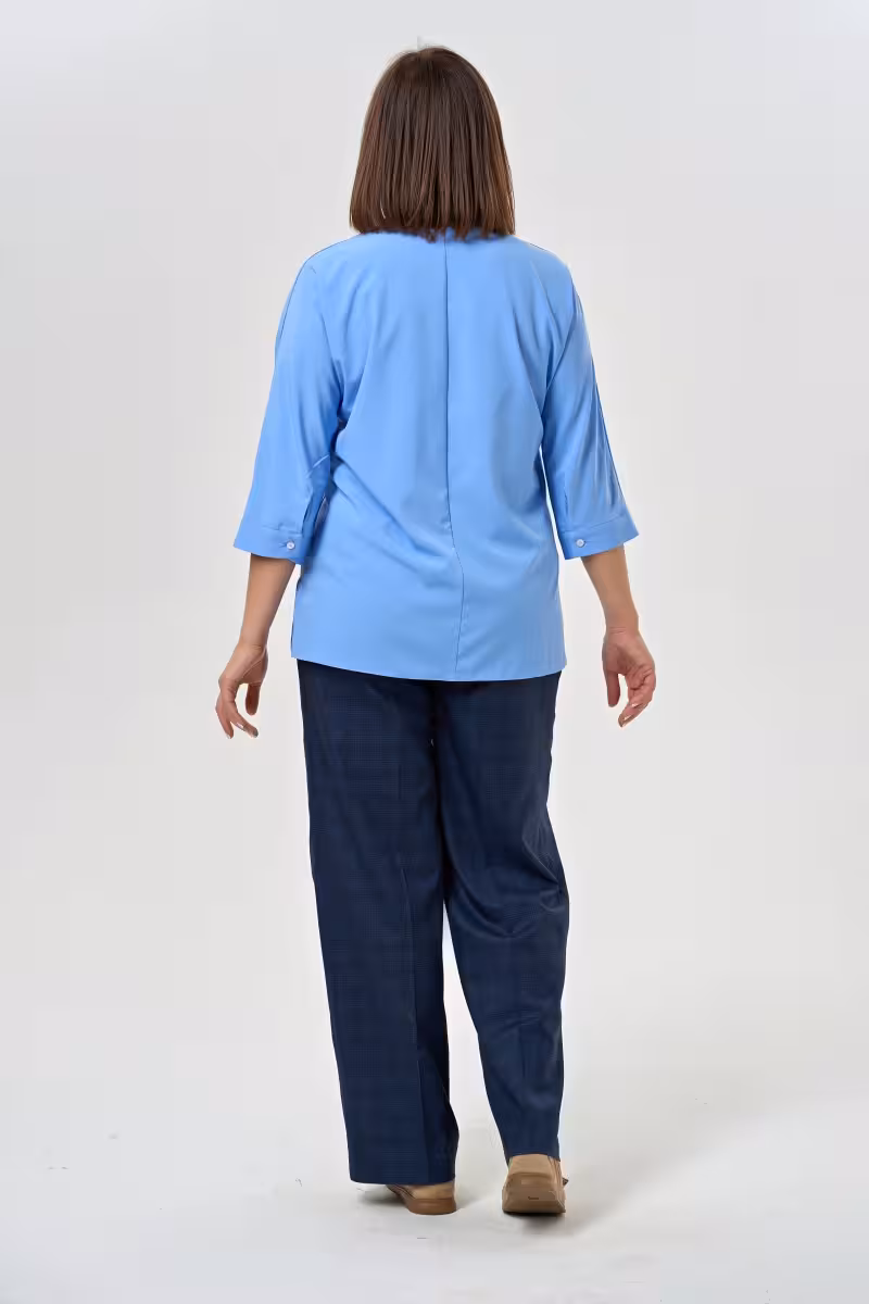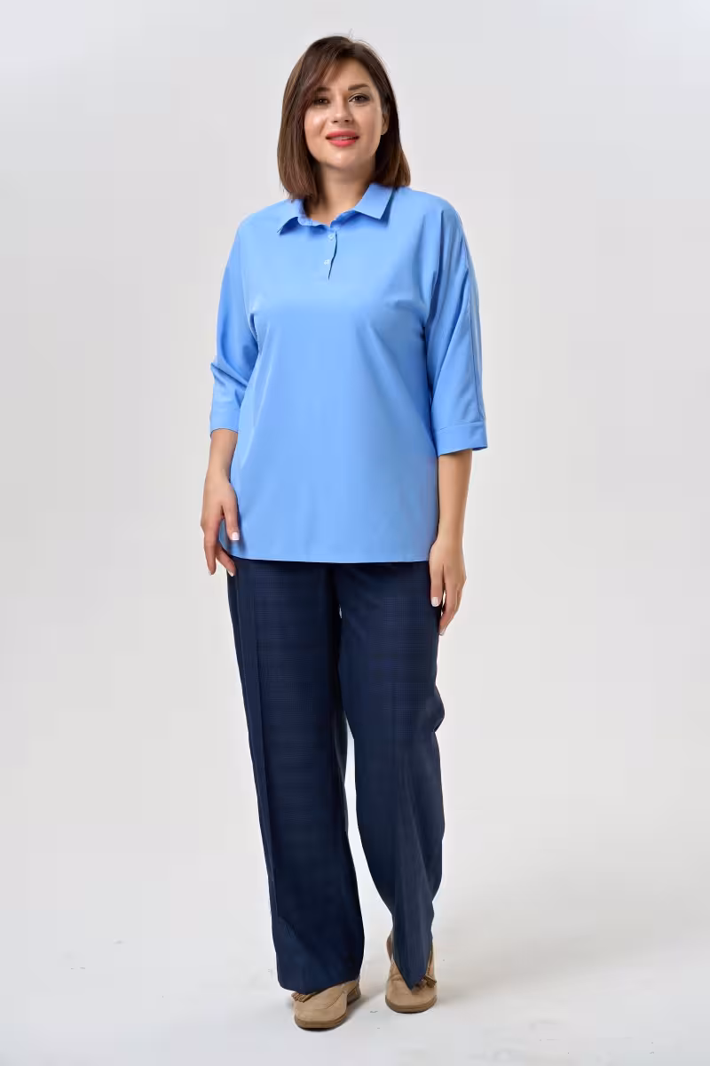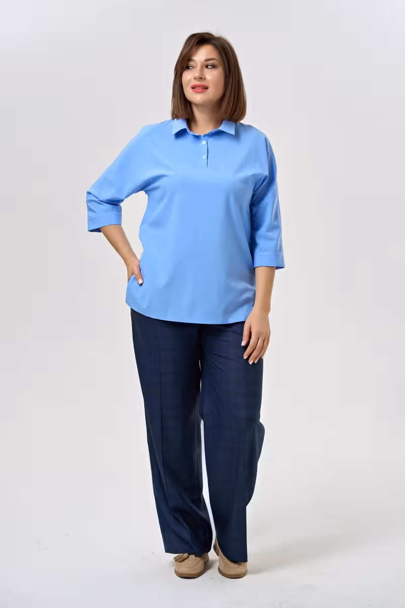Эта голубая блузка станет основой гардероба для тех кто ценит классическую элегантность. Свободный крой не сковывает движений а рукава длиной 7/8 придают образу особую изысканность – они короче полного рукава но длиннее рукава три четверти. Воротник подчеркивает линию шеи а планка с двумя пуговицами создает аккуратный акцент на груди. Разрезы по бокам делают силуэт более динамичным и позволяют блузке красиво драпироваться. Натуральная ткань дышит и комфортна в носке весь день. Этот оттенок голубого освежает лицо и сочетается с множеством цветов в гардеробе.Блузка прекрасно работает в деловых образах с классическими прямыми брюками и жакетом для офиса или деловой встречи. Для прогулки её можно носить с зауженными джинсами а для вечернего выхода – с брюками палаццо. Универсальность кроя позволяет создавать образы для любого случая жизни.