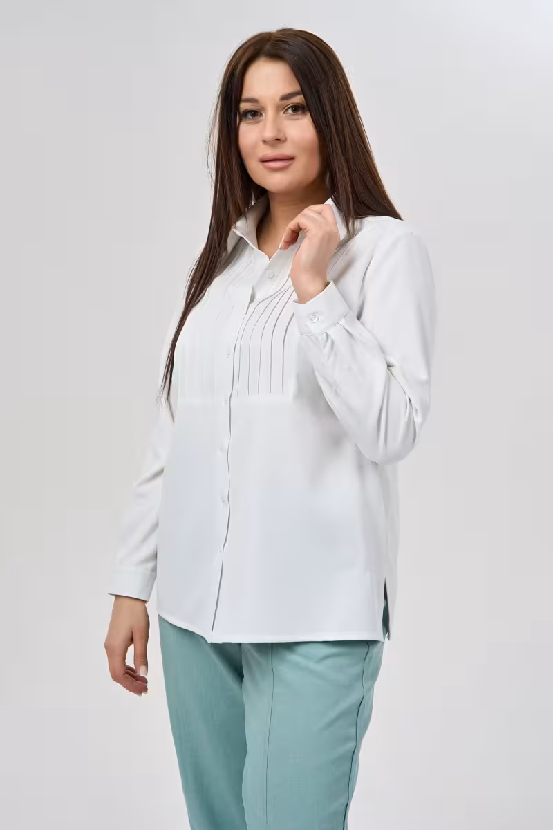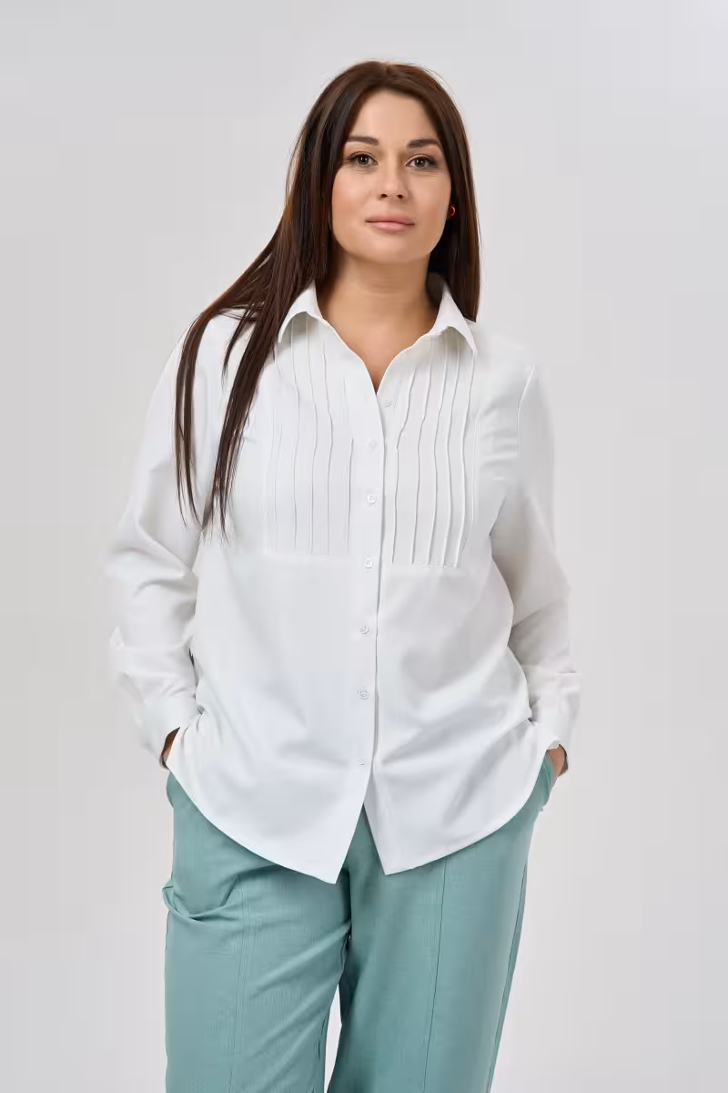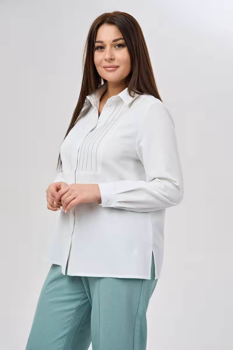 Классическая белая блузка с изящными складками на груди создает безупречный силуэт. Элегантная основа для деловых образов и повседневных луков. Воротник подчеркивает линию шеи а свободный крой обеспечивает комфорт на весь день.