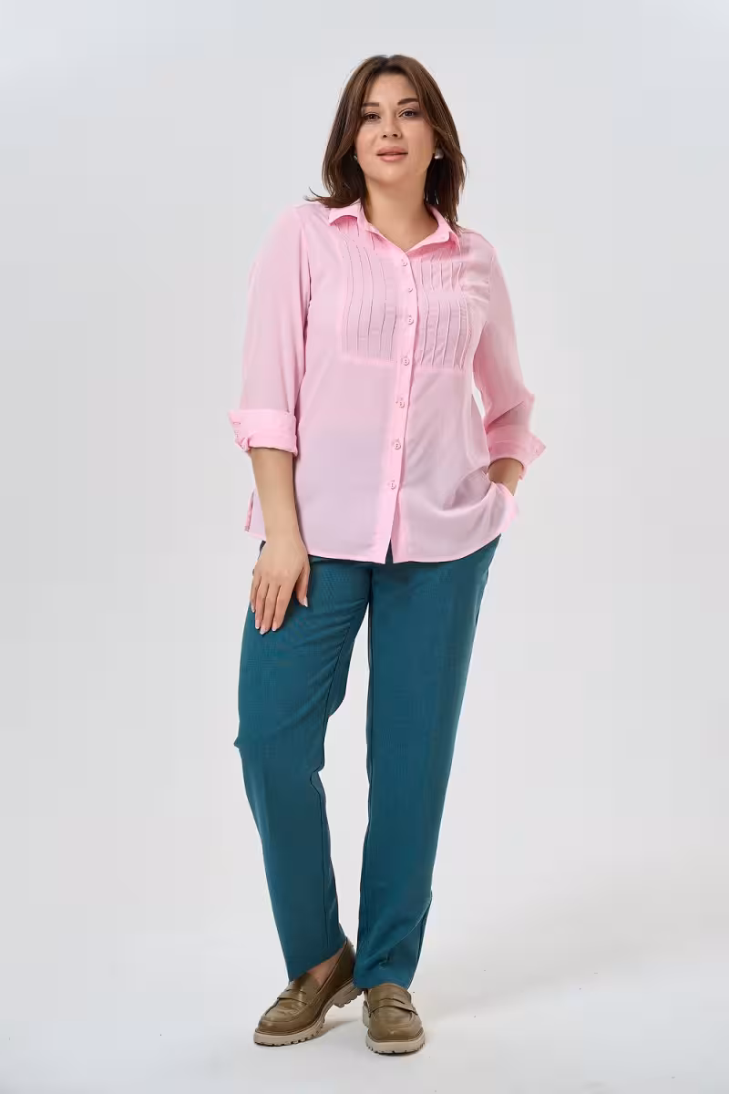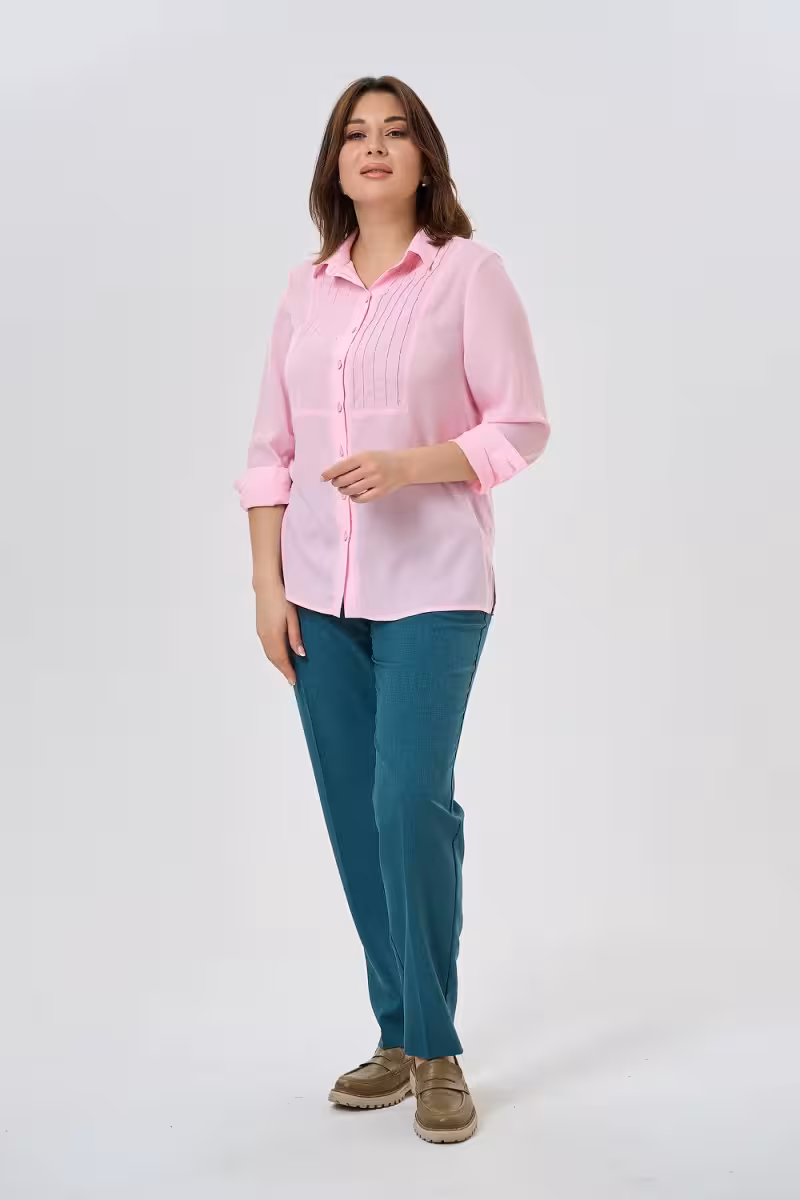 Розовая блузка становится свежим акцентом в мире строгих офисных луков. Полуприлегающий силуэт мягко обрисовывает фигуру не сковывая движений. Особенность модели — изящные складки на передней части которые создают легкую игру света и тени добавляя образу глубины.Классический воротник на небольшой стойке обрамляет лицо визуально удлиняя шею. Застежка на девять пуговиц проходит по центру позволяя варьировать глубину выреза в зависимости от повода. Спинка с горизонтальной линией на уровне лопаток создает красивую посадку по фигуре.Боковые разрезы обеспечивают свободу движений — важная деталь для активного ритма жизни. Натуральная ткань дышит и сохраняет форму в течение дня.Сочетается с темными зауженными брюками для делового образа с джинсами для прогулки или с юбкой-карандаш для вечернего выхода. Подходит для офиса деловых встреч и романтических свиданий. Универсальная длина рукава позволяет носить блузку круглый год.