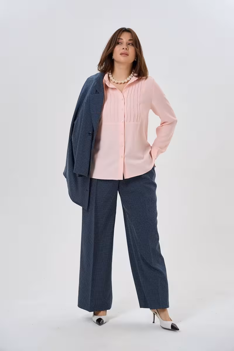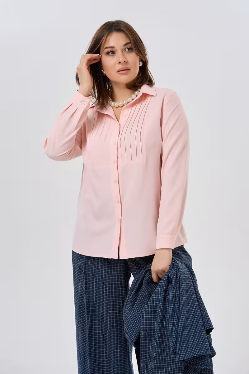 Нежный розовый оттенок превращает строгую классику в изысканную основу гардероба. Изящные складки на груди создают женственный силуэт а четкие линии воротника подчеркивают статус.