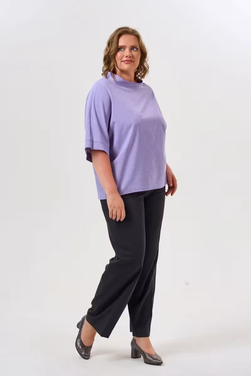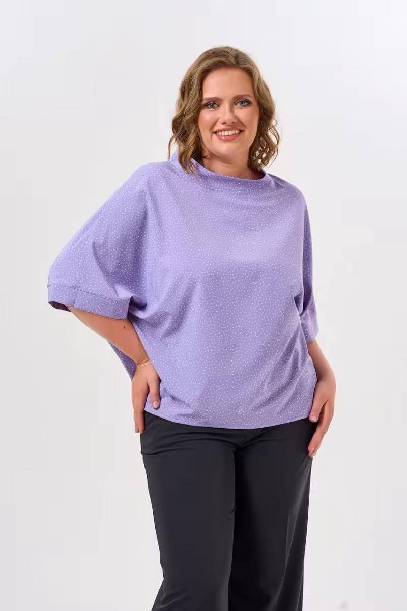 Лиловая блузка с мелким горошком дарит ощущение легкости и женственности. Свободный крой скрывает недостатки фигуры а рукава длиной три четверти создают изящную линию рук.