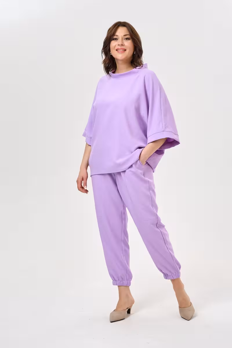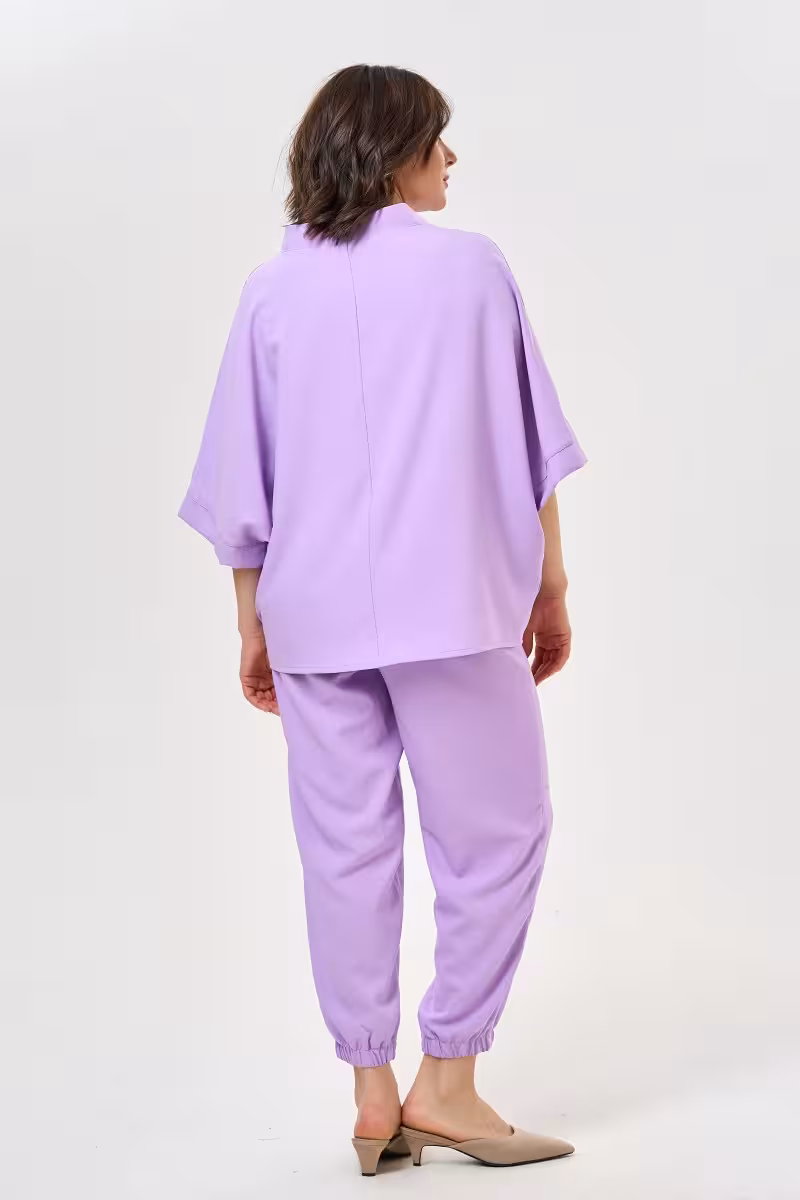 Свободная блузка с рукавами три четверти создает ощущение легкости и непринужденности. Элегантный воротник-стойка добавляет образу изысканности а асимметричный низ делает силуэт особенно женственным.