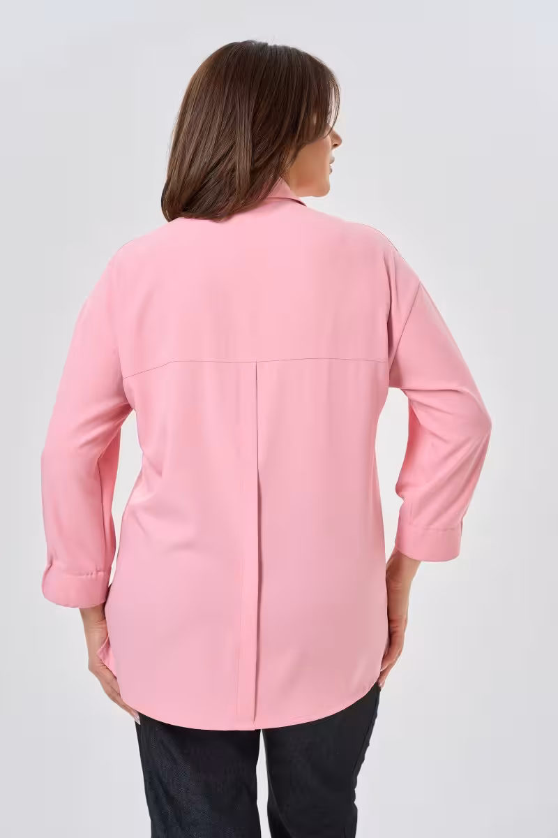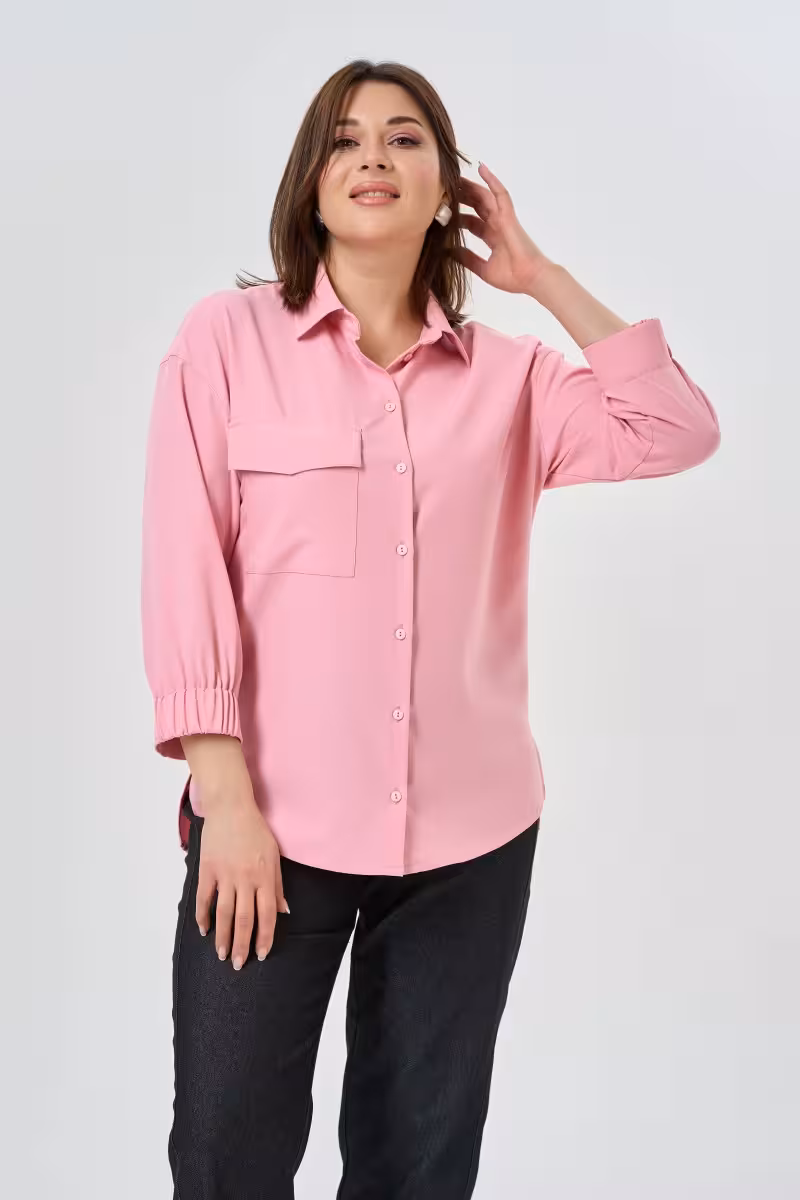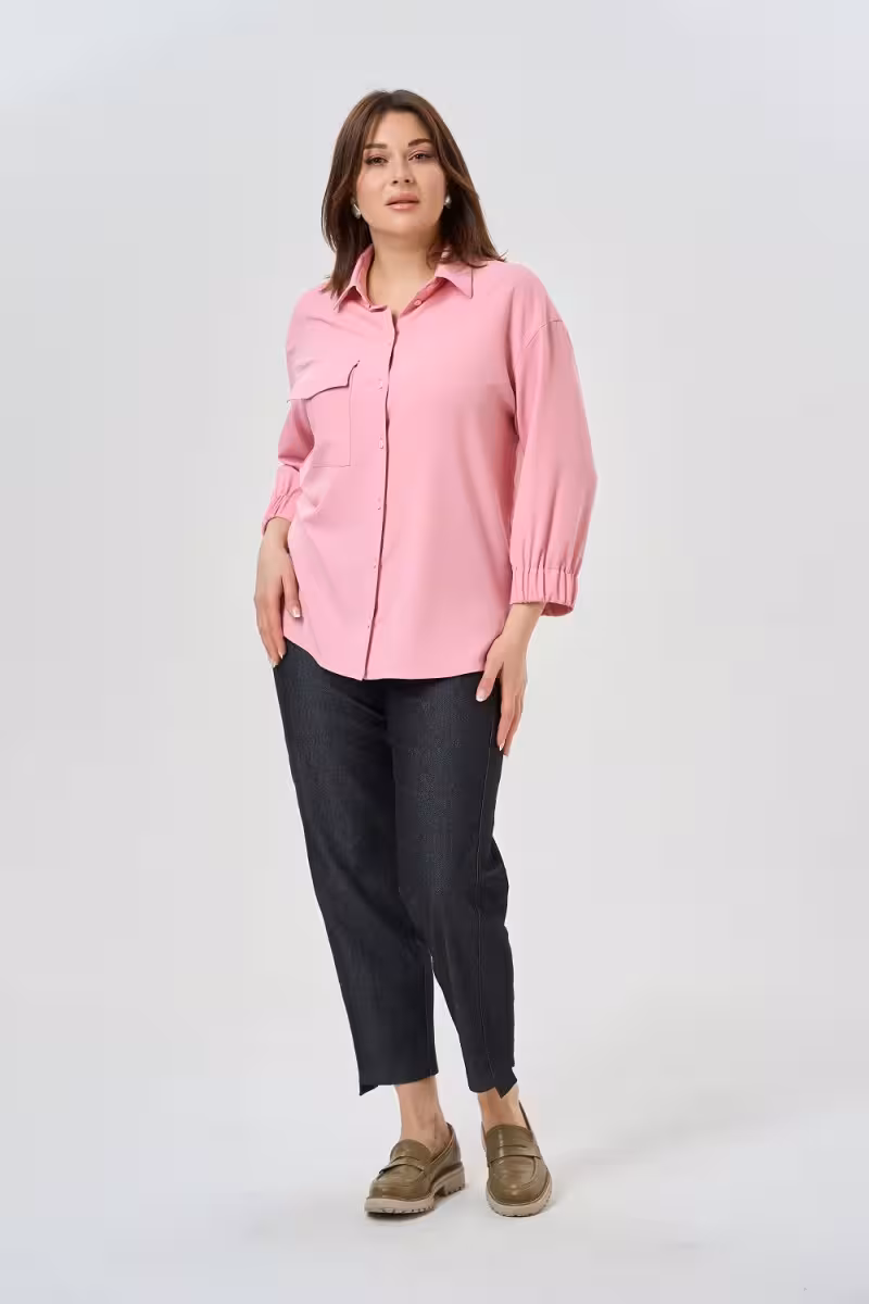 Эта блузка в пудрово-розовом цвете станет основой для множества стильных образов. Свободный крой не сковывает движения а объемные рукава с резинкой у запястья создают модный силуэт в духе современной классики. Отложной воротник на стойке и застежка на пуговицы по центру переда придают строгости которую смягчает романтичный оттенок ткани.Особый шарм модели – в деталях. Накладной карман с аккуратным клапаном не только украшает но и добавляет практичности. Асимметричный низ с разрезами по бокам делает силуэт легким и непринужденным. Спинка со складкой обеспечивает комфортную посадку.Качественная ткань держит форму и приятна к телу. Блузка прекрасно сочетается с прямыми деловыми брюками для офисного образа или с зауженными джинсами для прогулки по городу. С юбкой-карандаш создает элегантный лук для деловых встреч а с широкими брюками-палаццо – расслабленный weekend-стиль. Модель универсальна для офиса прогулок и неформальных встреч.