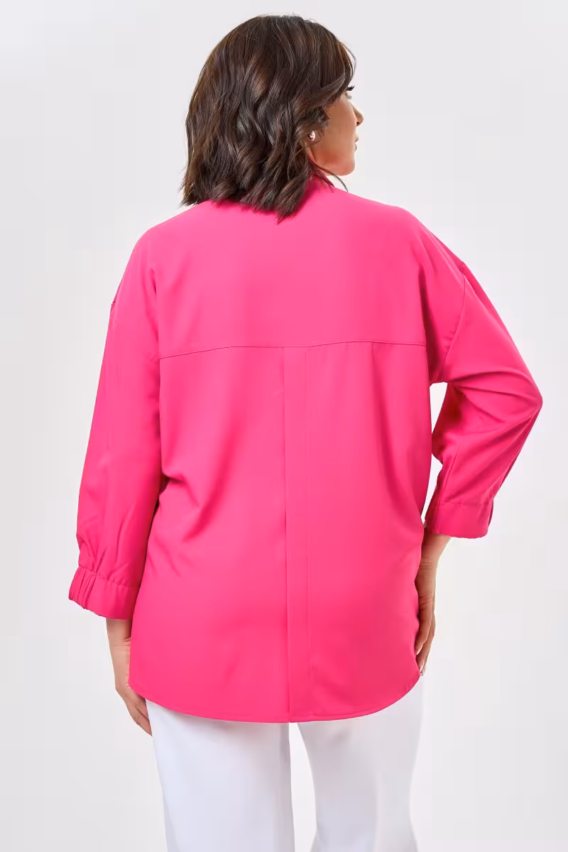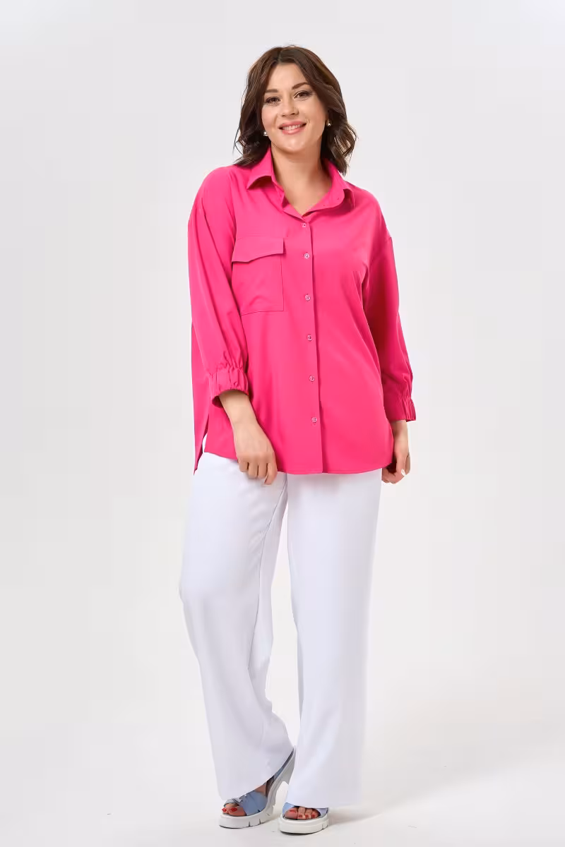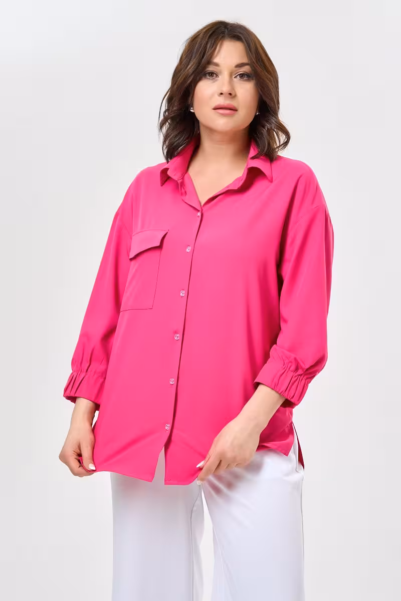 Свободная блузка привлекает внимание продуманными деталями и модным кроем. Рукава собранные на резинку у запястий создают изящный объем и подчеркивают женственность силуэта. Отложной воротник на стойке придает образу классическую элегантность а накладной карман с клапаном добавляет практичности и стиля.Особую изюминку модели придает асимметричный низ и вертикальная складка на спинке которые создают интересную игру линий. Разрезы по бокам обеспечивают свободу движений и добавляют динамики силуэту. Застежка на пуговицы позволяет носить блузку как полностью застегнутой так и открытой поверх топа.Качественная ткань держит форму и приятна к телу. Модель отлично сочетается с зауженными брюками для делового образа или с джинсами-скинни для прогулок по городу. В комплекте с прямыми брюками высокой посадки создает гармоничный офисный лук. Подходит для деловых встреч вечерних выходов и путешествий. Яркий розовый цвет освежает любой гардероб и поднимает настроение.