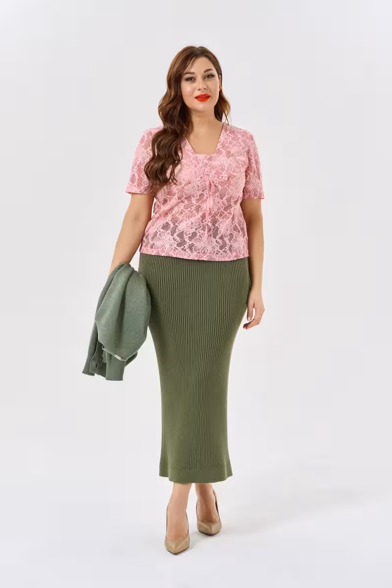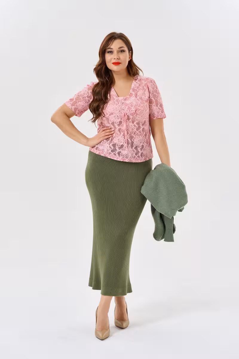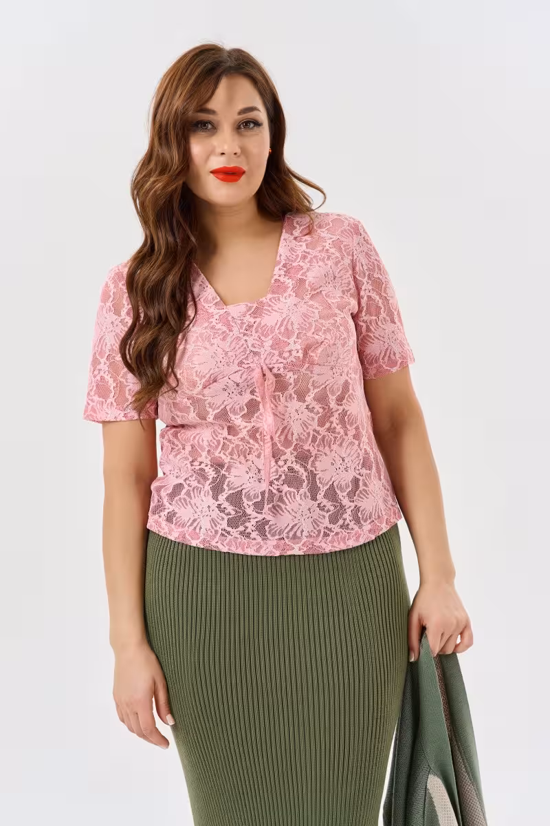 Романтичная кружевная блузка в нежно-розовом оттенке станет основой для создания женственных образов на любой случай. V-образный вырез красиво обрамляет линию декольте визуально удлиняя шею. Прилегающий силуэт подчеркивает естественные изгибы фигуры создавая элегантный контур.Короткие рукава делают модель универсальной для теплого сезона а изысканное кружевное полотно добавляет образу утонченности и благородства. Подрез под грудью создает красивую линию и подчеркивает талию. Частичная подкладка обеспечивает комфортную посадку и деликатность образа.Блузка прекрасно сочетается с деловыми прямыми брюками для офиса или встреч. Для прогулок можно дополнить образ свободными брюками-бананами и легким жакетом. Зауженные брюки высокой посадки создадут элегантный вечерний лук.Модель подходит для деловых встреч романтических свиданий или светских мероприятий. Нежное кружево и изысканный крой делают каждый образ запоминающимся и женственным.