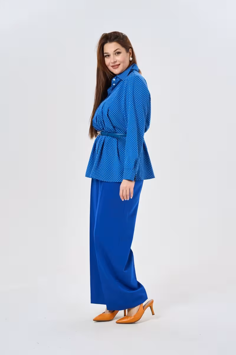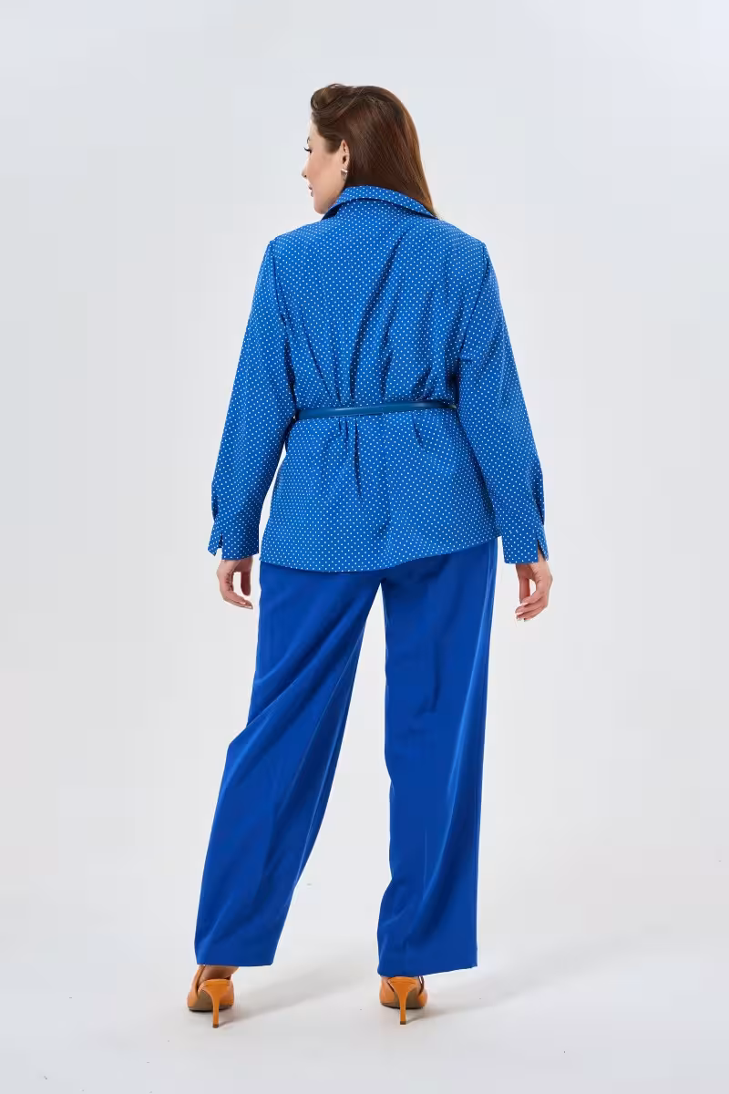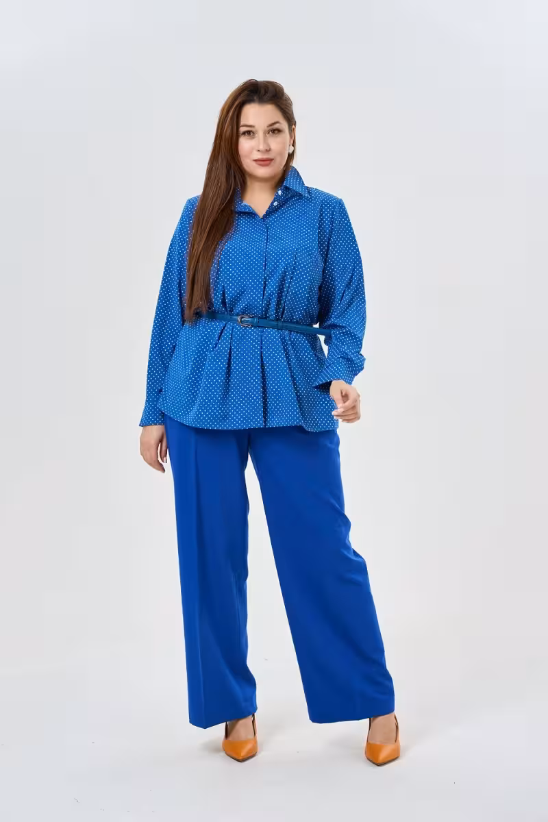 Блузка прямого силуэта в синем горошке воплощает баланс между классикой и современностью. Отложной воротник на стойке создает четкую линию подчеркивая изящество шеи и придавая образу особую элегантность. Мягкие складки по переду добавляют объем и женственность визуально моделируя силуэт.Длинные рукава с аккуратными манжетами завершают классический образ делая блузку идеальной для деловых встреч и офисных будней. Прямой силуэт универсален – он подходит разным типам фигуры создавая комфортную посадку без лишних ограничений.Качественная ткань держит форму после стирки сохраняя безупречный внешний вид. Принт в горошек добавляет игривости строгому деловому стилю позволяя носить блузку не только в офисе но и на прогулках или встречах с друзьями.Сочетается с прямыми деловыми брюками для создания офисного образа с брюками-палаццо для casual-лука или с зауженными брюками для вечернего выхода. Дополните образ жакетом для важных деловых встреч или носите самостоятельно во время путешествий и прогулок.