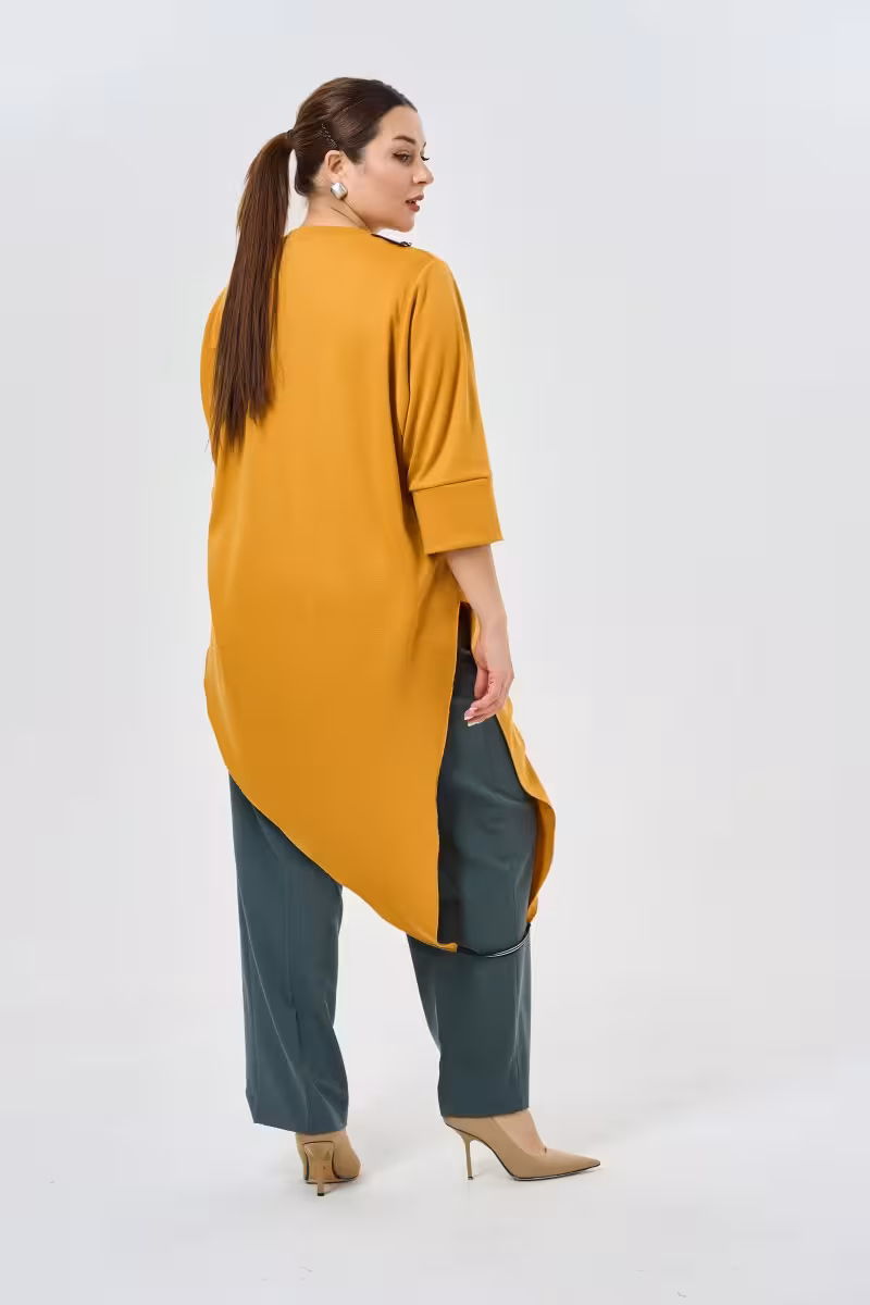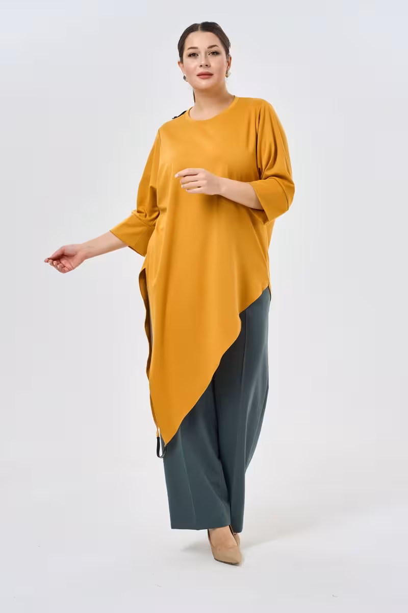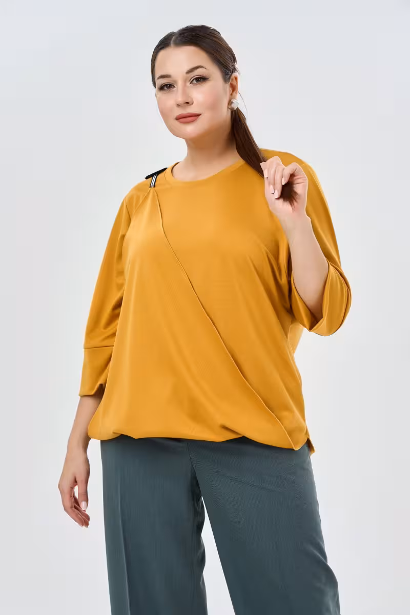Эта блузка в насыщенном горчичном цвете станет ярким акцентом гардероба. Свободный силуэт дарит комфорт в течение всего дня а рукава 3/4 с изящной отделкой по краю добавляют женственности образу. Круглая горловина подчеркивает линию шеи создавая гармоничные пропорции.Главная изюминка модели – асимметричный низ с удлиненной правой стороной. Разрез по боку не только добавляет динамики силуэту но и позволяет экспериментировать со стилем. Декоративная резинка соединяет края разреза давая возможность перекинуть удлиненную часть через плечо для создания необычного драпированного эффекта.Качественная ткань приятна к телу и сохраняет форму после стирки. Горчичный оттенок прекрасно сочетается как с деловыми прямыми брюками для офиса так и со свободными брюками-бананами для прогулок. Для вечернего выхода дополните образ зауженными брюками и изящными аксессуарами. Универсальная модель подойдет для деловых встреч путешествий и повседневных выходов в город.
