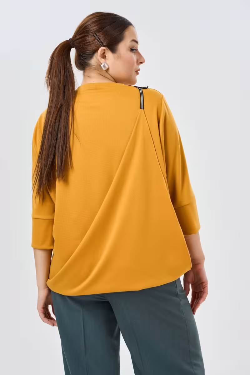 Блузка свободного кроя в солнечном горчичном оттенке с интригующей асимметрией по низу. Рукава длиной 3/4 с аккуратной отделкой создают элегантный силуэт. Особая фишка модели – возможность трансформировать правую часть в стильную деталь на плече благодаря декоративной резинке.