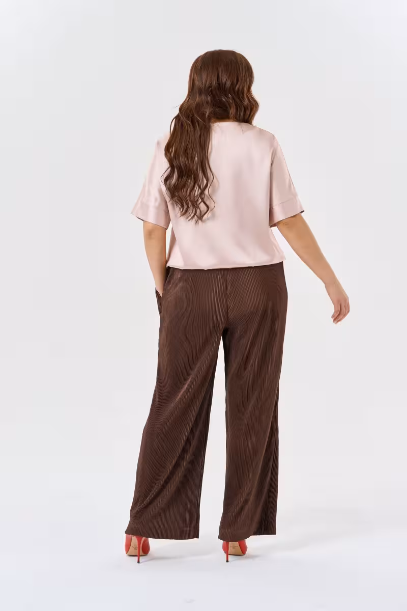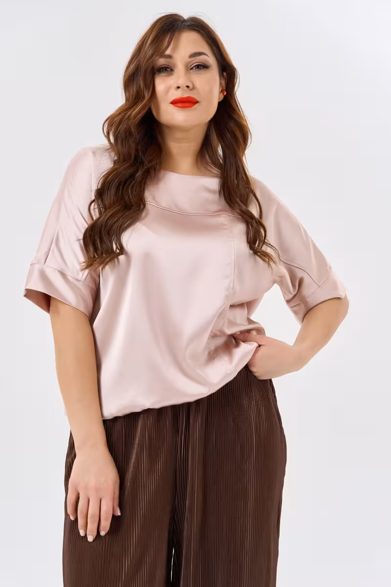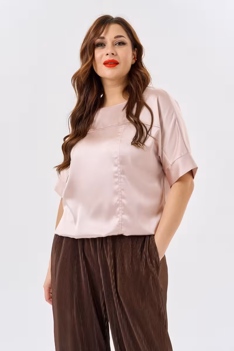 Эта блузка воплощает философию современной городской жизни – когда хочется выглядеть стильно но чувствовать себя свободно. Свободный силуэт не сковывает движения а декоративные швы на груди превращают простую вещь в дизайнерскую находку. Горизонтальная линия подчеркивает грудь а вертикальная создает интересную геометрию.Короткие рукава завершаются аккуратными манжетами которые добавляют структурности общему образу. Круглая горловина универсальна для любого типа лица. Мягкая резинка по низу позволяет носить блузку навыпуск или слегка заправленной.Нежный розовый оттенок освежает лицо и прекрасно сочетается с коричневыми брюками-бананами для прогулок по городу. С зауженными брюками создает более собранный образ для встреч. Качественная ткань держит форму и приятна к телу.Эта блузка станет основой для множества образов – от casual с джинсами до более элегантных сочетаний с брюками и аксессуарами.