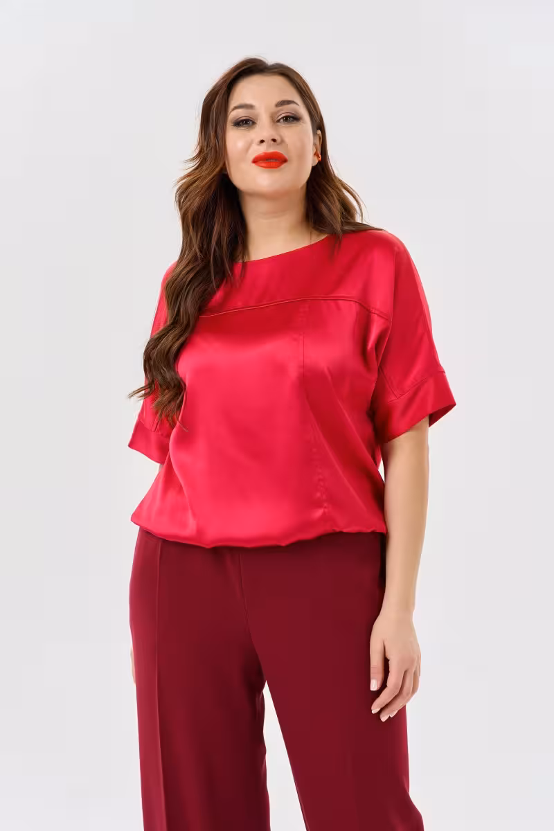 Атласная блузка насыщенного красного цвета с продуманными декоративными линиями создает безупречный праздничный образ. Свободный крой и мягкая резинка по низу обеспечивают комфорт во время торжественных мероприятий.
