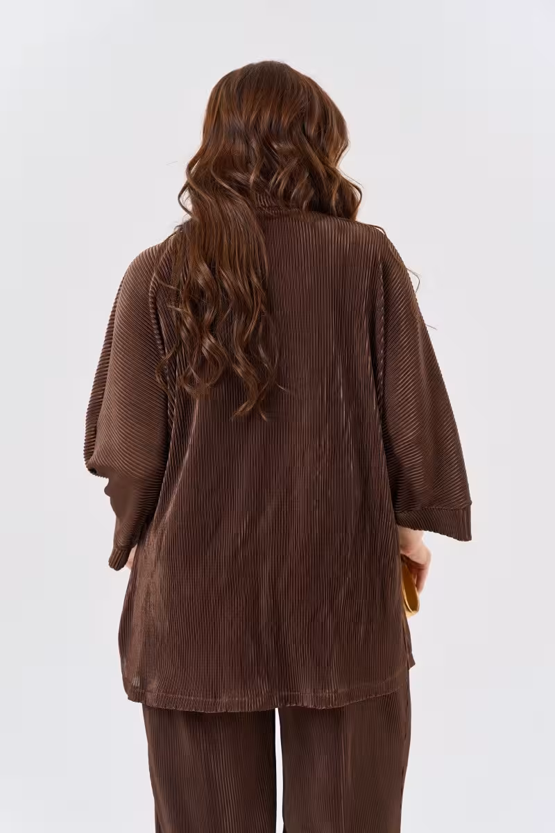 Роскошная рифленая блузка цвета горького шоколада создает образ современной городской женщины. Свободный крой позволяет чувствовать себя комфортно на любом празднике. Асимметричный низ добавляет динамики классическому силуэту.
