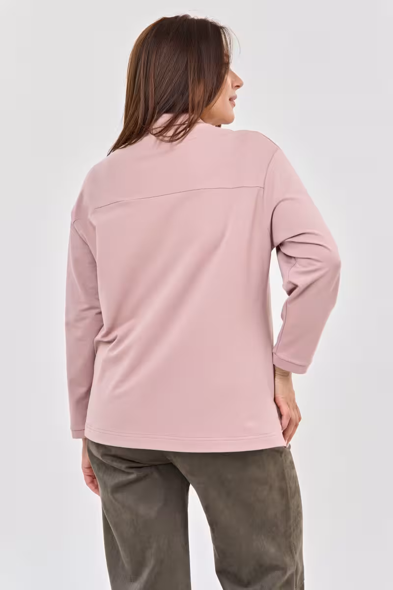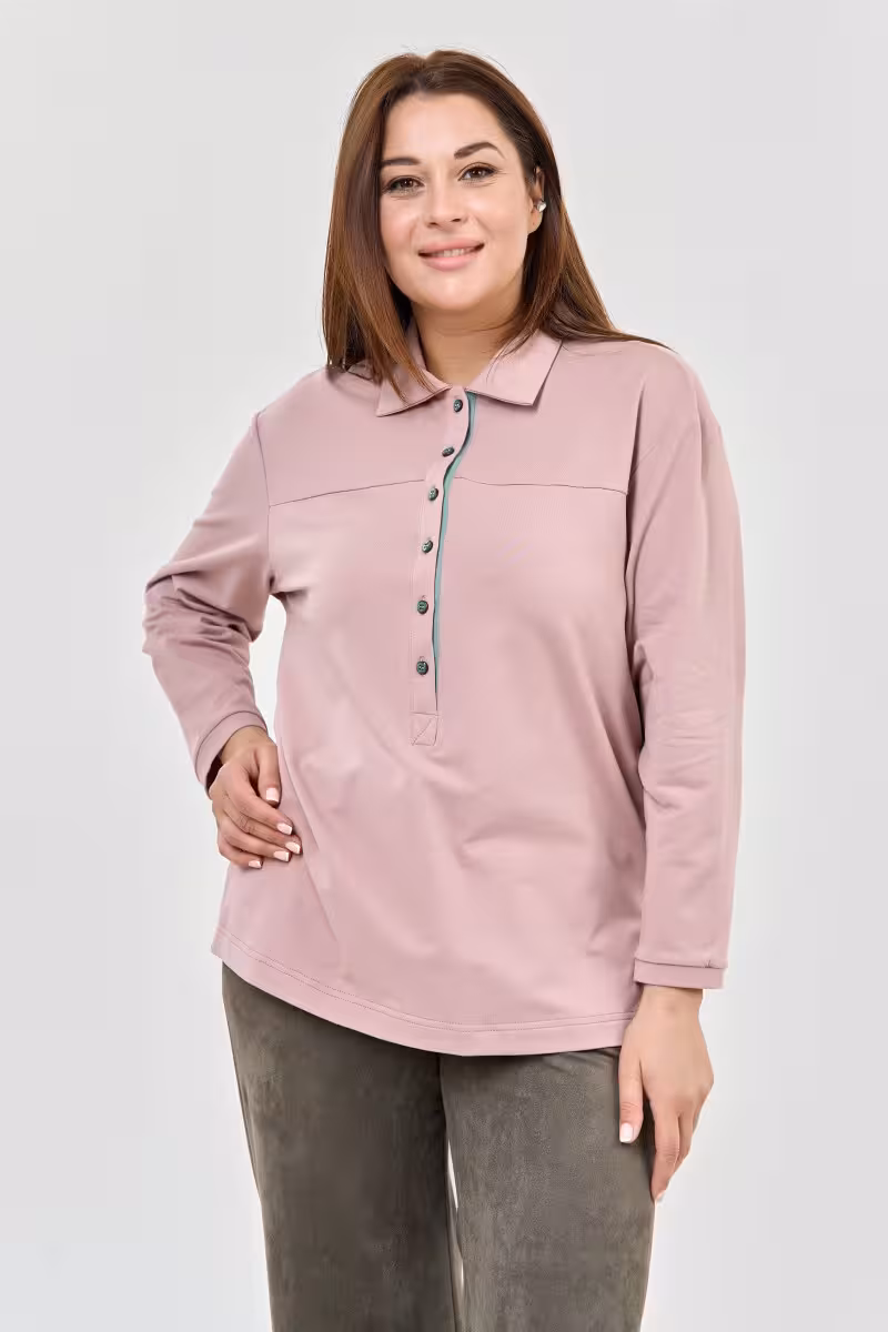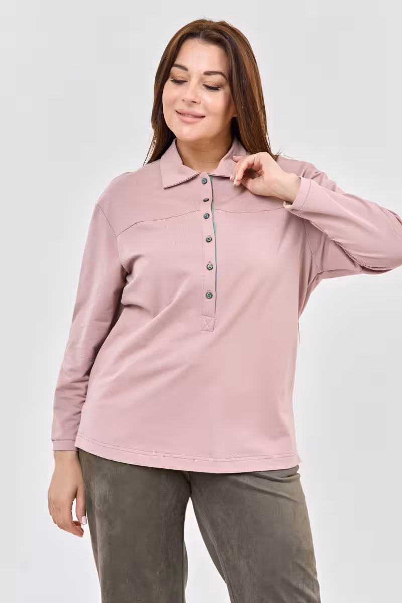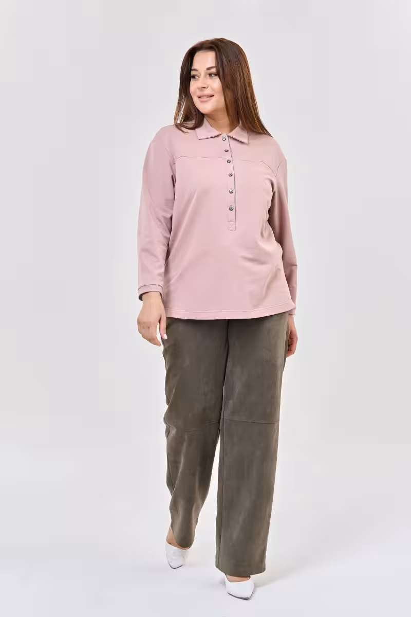Трикотажная блузка в нежном розовом оттенке станет основой гардероба для тех кто ценит комфорт без компромиссов стилю. Классический отложной воротник придает образу собранность и элегантность подходящую как для деловых встреч так и для неформальных мероприятий. Центральная планка с шестью пуговицами создает четкую вертикальную линию визуально стройнит силуэт.Мягкое трикотажное полотно приятно к телу и обеспечивает свободу движений в течение всего дня. Длинные рукава завершаются аккуратными планками добавляя образу завершенности. Прямой силуэт универсален и подходит разным типам фигуры.Блузка прекрасно сочетается с прямыми деловыми брюками для офисного дресс-кода или с зауженными моделями для вечернего выхода. В паре с брюками-бананами создает расслабленный образ для прогулок по городу. Разрезы по бокам добавляют динамичности и облегчают посадку. Блузка розовая с воротником позволяет носить заправленной для создания четких линий или свободно для более casual настроения. Качественная ткань сохраняет форму