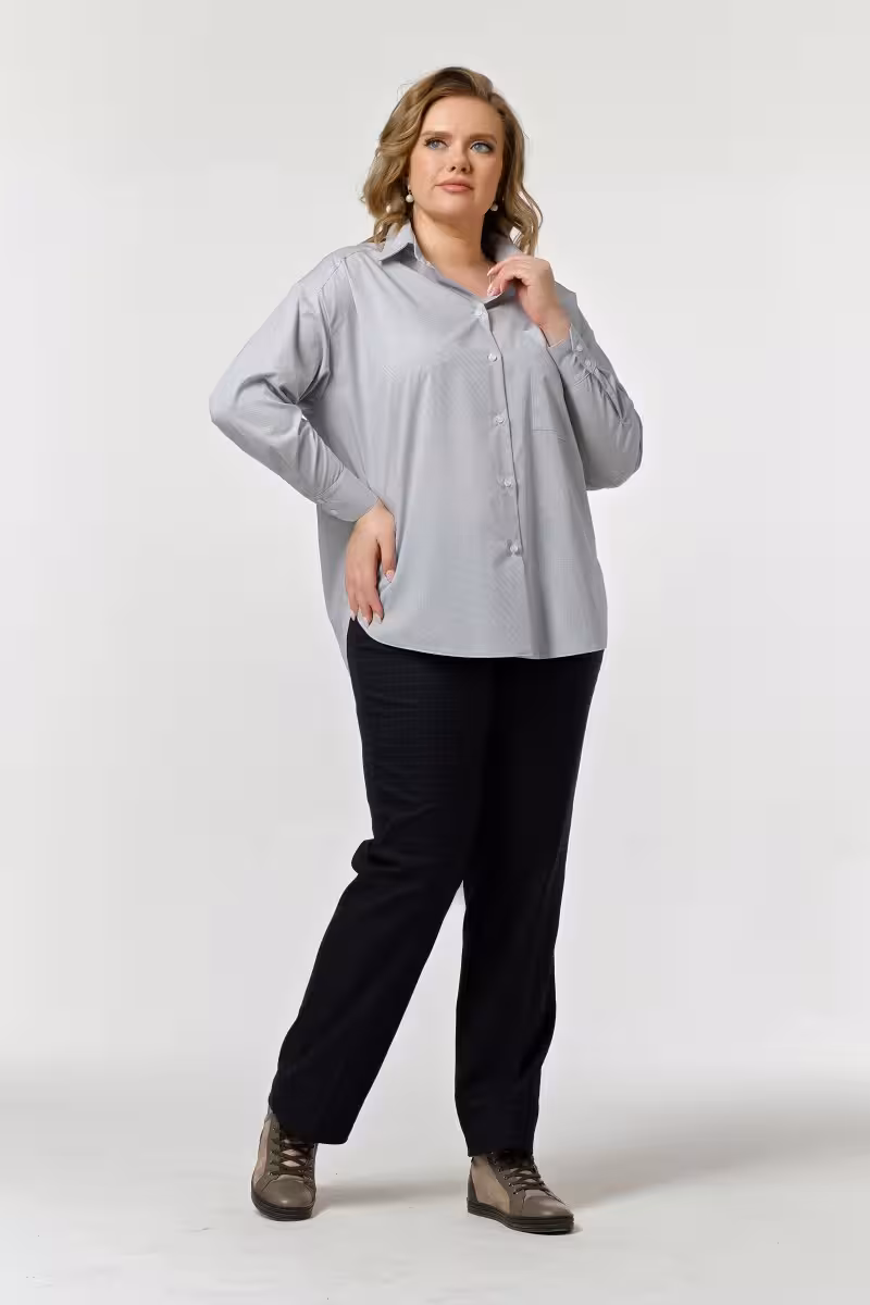 Эта блузка воплощает современный подход к деловой элегантности. Свободный силуэт не сковывает движения и создает непринужденный образ для насыщенного дня. Длинный рукав делает модель универсальной для делового образа в любое время года.Особенностью блузки стал асимметричный низ – спинка длиннее переда что придает силуэту динамичность и современное звучание. Накладной карман слева добавляет практичности и поддерживает лаконичную эстетику. Застежка на семь пуговиц по центру подчеркивает классическую основу модели.Тонкая полоска превращает базовую вещь в стильную основу гардероба. Качественная хлопковая ткань обеспечивает комфорт на весь день и легко переносит частые стирки.Блузка органично вписывается в офисный дресс-код с брюками-карандашом создает расслабленный образ с джинсами для дружеской встречи. С юбкой миди получается женственный лук для деловой встречи. Модель подходит для офиса важных переговоров и повседневных дел когда нужно выглядеть собранно и стильно.