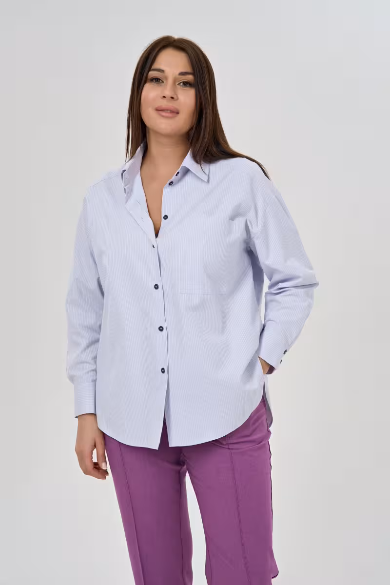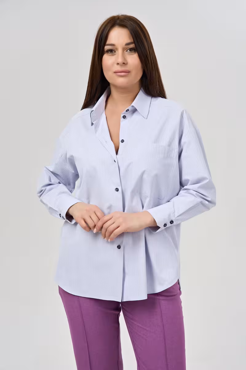 Эта блузка станет настоящим мультитулом в женском гардеробе. Свободный силуэт не сковывает движения и подходит для разных типов фигуры создавая непринужденный элегантный образ. Длинные рукава делают модель универсальной для делового дресс-кода и повседневных выходов.Особый шарм придает асимметричный фигурный низ – сзади блузка длиннее что визуально вытягивает силуэт. Накладной карман на груди добавляет практичности и создает интересный акцент в лаконичном дизайне. Застежка на пуговицы позволяет регулировать степень открытости декольте.Сочетайте с брюками-карандаш для строгого офисного лука или с джинсами для расслабленного casual-образа. С юбкой получится женственный комплект для дружеских встреч или свиданий. Качественная ткань держит форму после стирок и не мнется в течение дня.Модель одинаково хороша для деловых встреч офисных будней и неформальных мероприятий. Нейтральная цветовая гамма легко комбинируется с любыми оттенками базового гардероба.