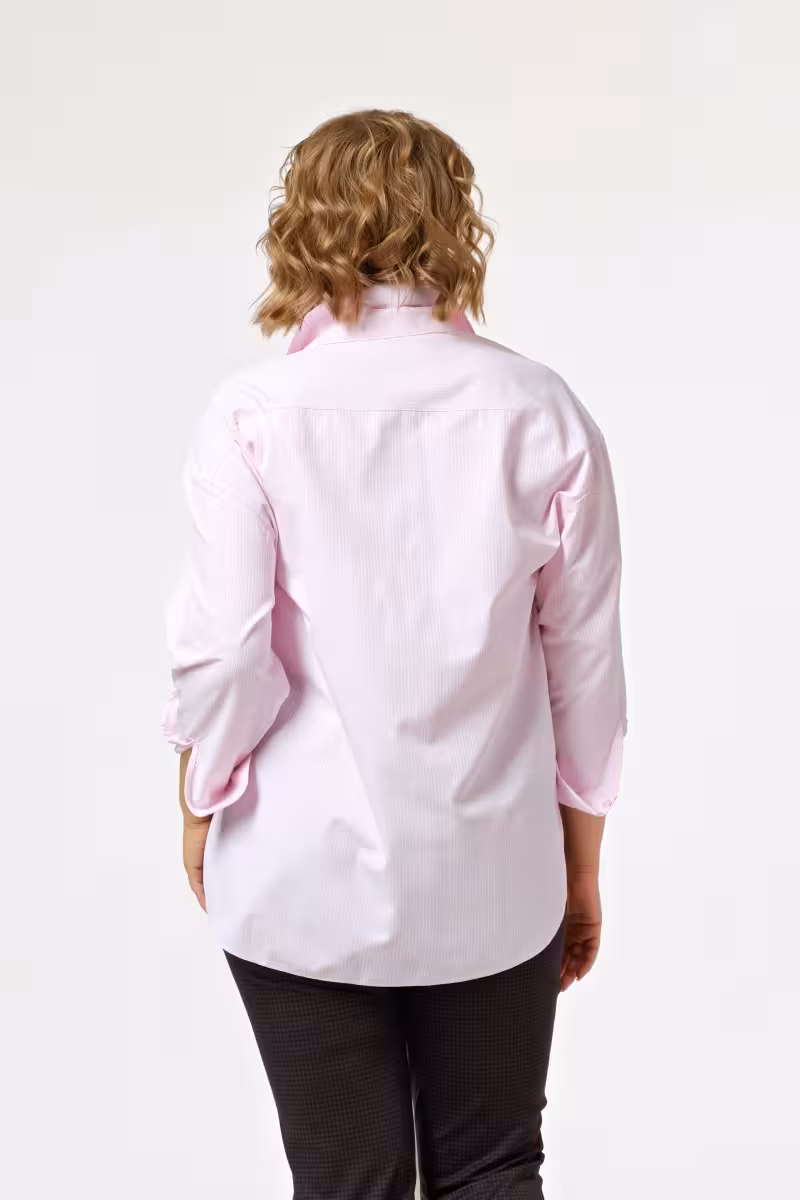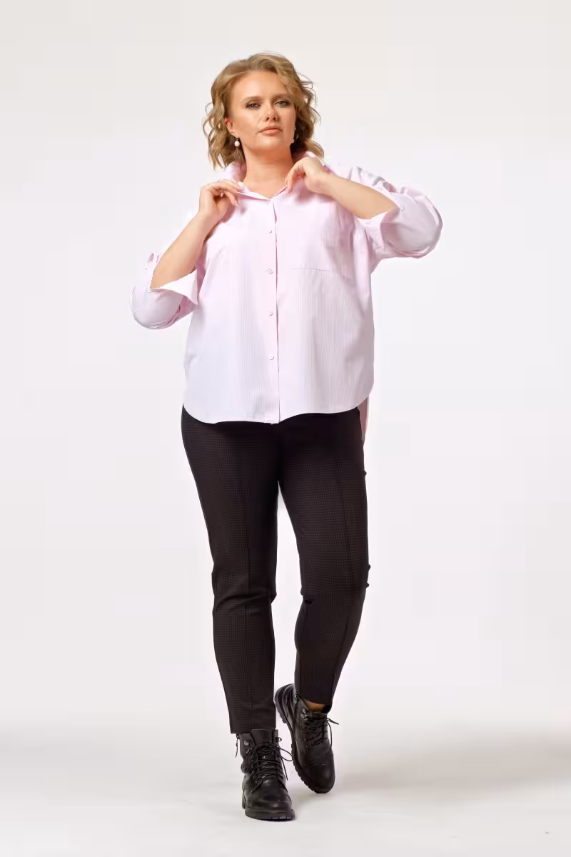 Женская свободная розовая рубашка станет основой для множества образов. Длинные рукава подчеркивают элегантность силуэта создавая баланс между деловым стилем и casual-комфортом. Накладной карман слева добавляет практичности и визуального интереса. Застежка на семь пуговиц по центру позволяет варьировать глубину выреза в зависимости от настроения и случая.Особенность модели – асимметричный низ с удлиненной спинкой который создает современную динамику и позволяет носить рубашку как заправленной так и навыпуск. Мягкий хлопок обеспечивает воздухопроницаемость и приятные тактильные ощущения.Сочетается с брюками-карандашом для деловых встреч создавая образ уверенной в себе женщины. С джинсами превращается в идеальный выбор для дружеских встреч и прогулок по городу. Юбка-карандаш или плиссированная юбка добавят женственности для свидания или вечеринки. Универсальность этой модели позволяет легко переходить от офисных задач к личным планам просто меняя аксессуары и низ.