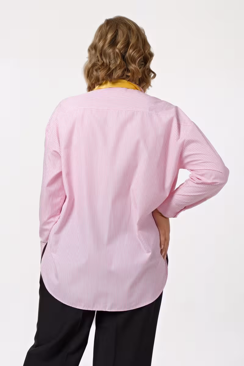 Полосатая блузка свободного силуэта словно создана для тех кто ценит комфорт без компромиссов со стилем. Мягкие линии кроя позволяют чувствовать себя естественно в любой ситуации – от утренней планерки до позднего ужина с подругами. Длинный рукав делает образ завершенным для делового дресс-кода но достаточно расслабленным для weekend-прогулок. Накладной карман слева добавляет функциональности и создает интересную асимметрию. Семь пуговиц по центру образуют четкую вертикаль которая визуально вытягивает силуэт. Удлиненная сзади модель прекрасно скрывает особенности фигуры и добавляет образу современности.Натуральный хлопок обеспечивает приятные ощущения на коже весь день. Эта блузка одинаково хороша с брюками-карандашом для офиса и с джинсами для casual-встреч. Полоски никогда не выходят из моды а свободный крой делает вещь универсальной для любого телосложения. Идеальный выбор для создания непринужденного но стильного образа.