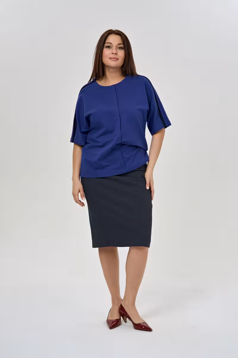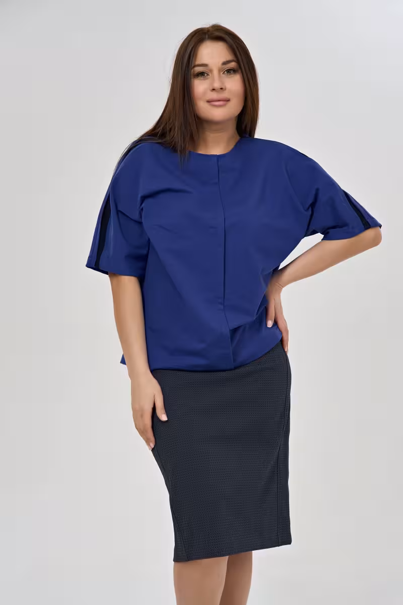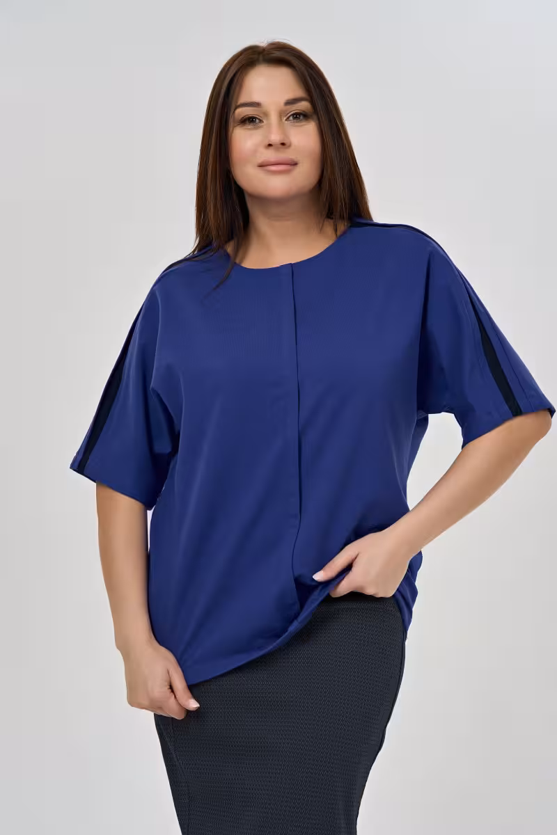Эта трикотажная блузка станет основой гардероба для тех кто ценит комфорт без компромиссов со стилем. Свободный силуэт не сковывает движения позволяя чувствовать себя уверенно в любой ситуации. Округлый вырез обрамляет декольте мягкими линиями а рукав до локтя добавляет элегантности повседневному образу.Центральная складка по переду создает интересную игру света и тени визуально вытягивая фигуру. Контрастная отделка вдоль плечевой линии выглядит как дизайнерская деталь превращая простую вещь в стильный акцент. Трикотажное полотно приятно к телу и не мнется что особенно важно для динамичного ритма жизни.Блузка универсально сочетается с брюками-карандашом для деловых встреч или с джинсами для дружеских посиделок. В офисе она создаст строгий но не скучный образ особенно в паре с юбкой. Насыщенный синий цвет освежает лицо и подходит большинству цветотипов. Это та самая вещь которая работает на стыке casual и делового стиля позволяя выглядеть собранно и современно одновременно.