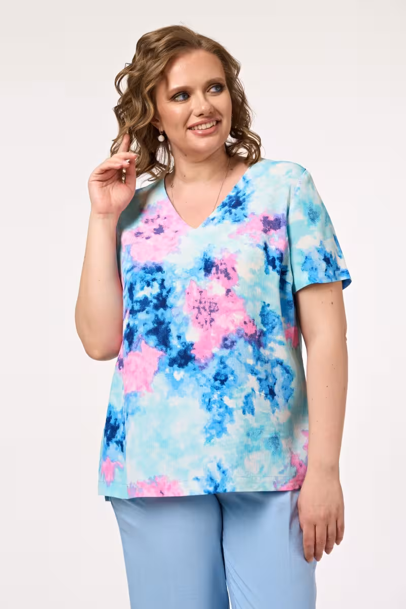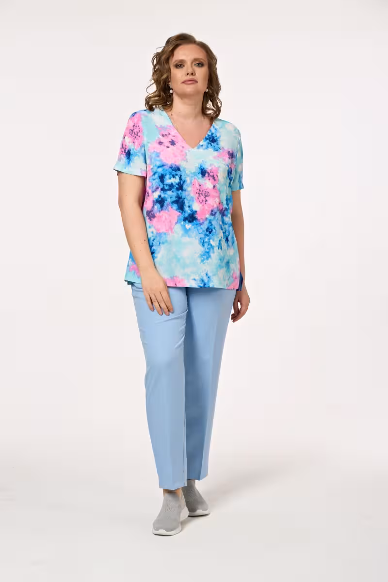 Блузка прямого силуэта воплощает философию современной женщины – быть собой в любой ситуации. Глубокий V-образный вырез визуально удлиняет шею и создает соблазнительную линию декольте. Свободный крой не сковывает движения позволяя чувствовать себя комфортно с утра до вечера.Короткие рукава освобождают руки для активной жизни будь то деловая встреча или прогулка в парке. Боковые разрезы внизу добавляют динамики силуэту и обеспечивают дополнительную свободу при ходьбе. Качественная ткань мягко облегает фигуру не создавая лишнего объема.Универсальность модели открывает безграничные возможности для экспериментов со стилем. С прямыми деловыми брюками и жакетом образ приобретает офисную элегантность. Сочетание с зауженными брюками создает современный casual-лук для вечернего выхода. Свободные брюки-бананы превращают комплект в идеальный выбор для путешествий и прогулок.Модель подходит для офиса деловых встреч вечеринок и повседневной жизни подчеркивая индивидуальность и чувство стиля.