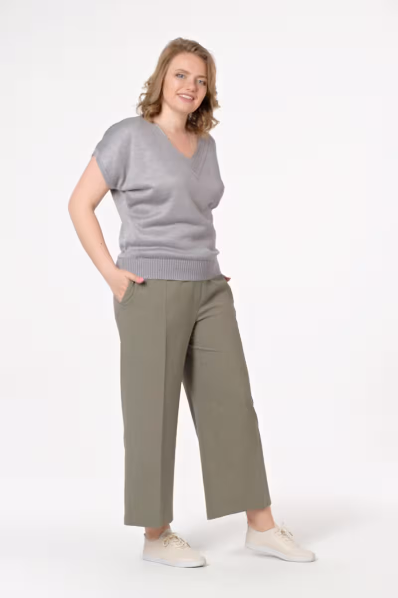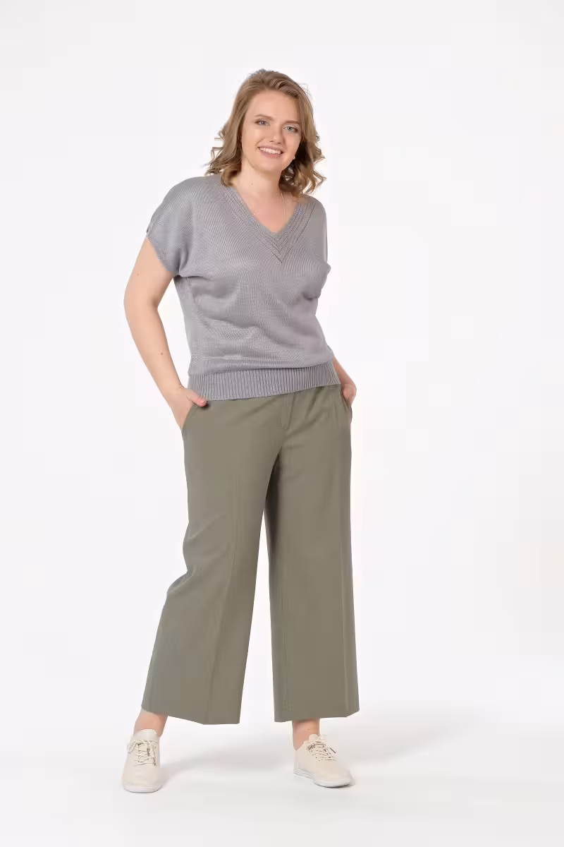 Свободные брюки с широким кроем создают ощущение легкости и непринужденности. Укороченная длина до щиколотки добавляет современности классическому силуэту. Пояс с эластичными вставками сзади обеспечивает комфорт на весь день.