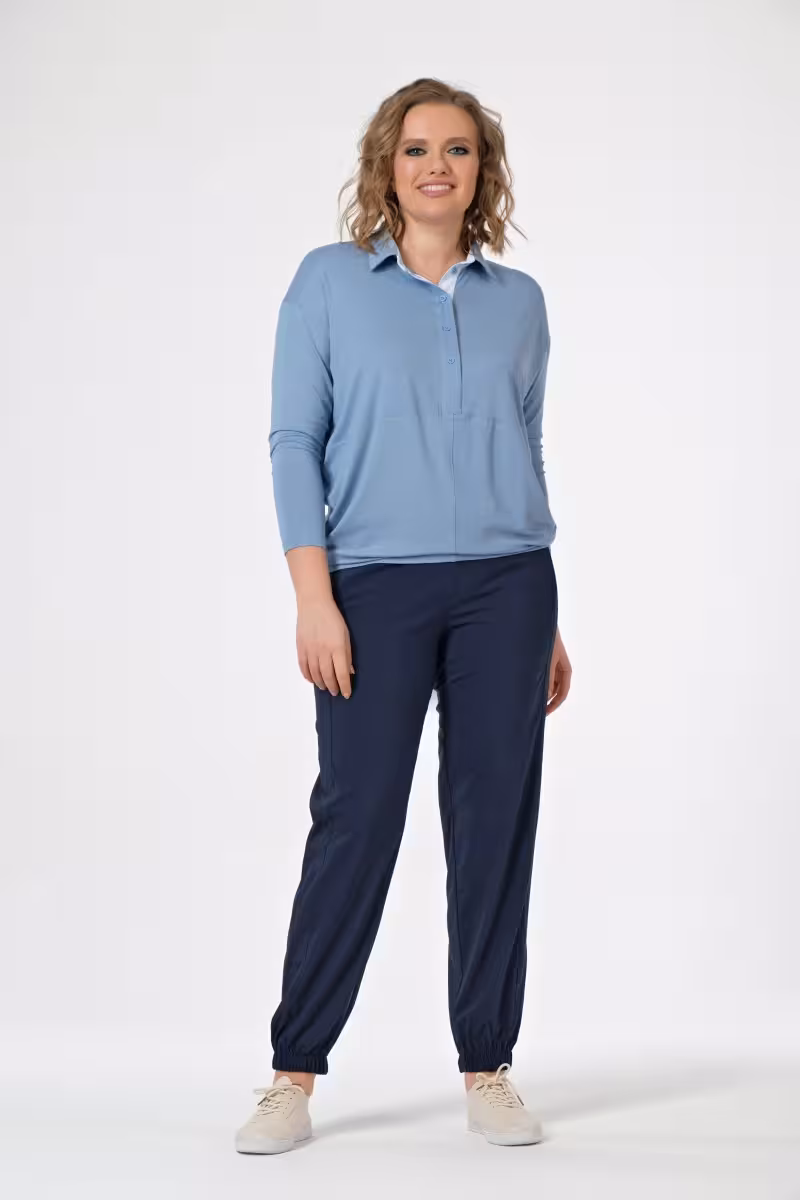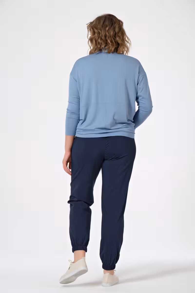 Свободный силуэт создает ощущение невесомости и комфорта в движении. Резинка внизу добавляет современную спортивную ноту классическому крою. Универсальная основа для образов от прогулочных до офисных.