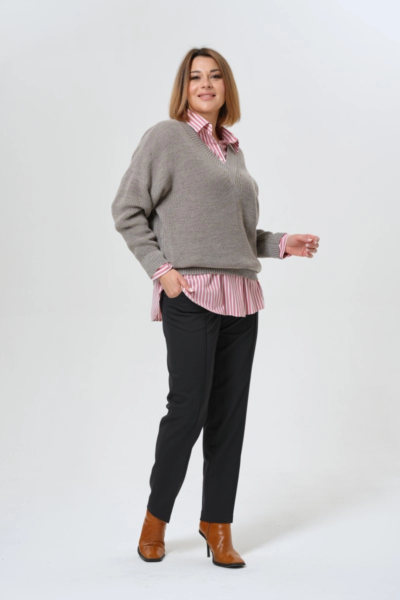 В каталоге представлены модели с прямым и слегка зауженным силуэтом в нейтральной палитре — чёрный, графит, молочный, бежевый — и в размерном ряду от 40 до 68. Каждая модель рассчитана на длительную носку: крой адаптирован под реальный ритм жизни, а не только под примерочную.