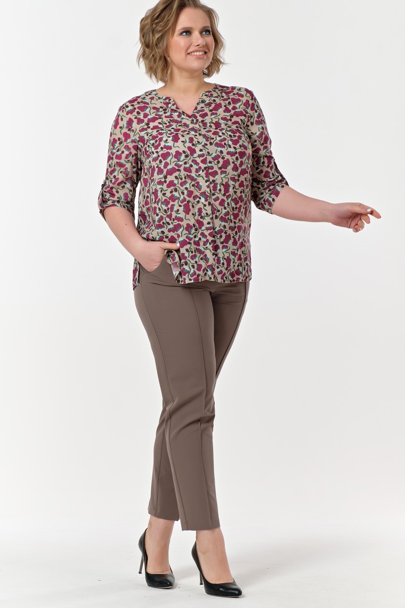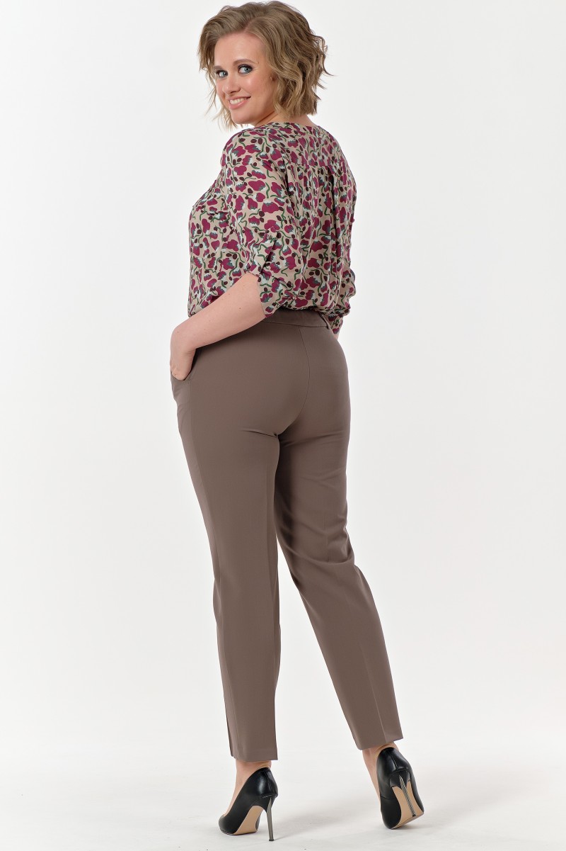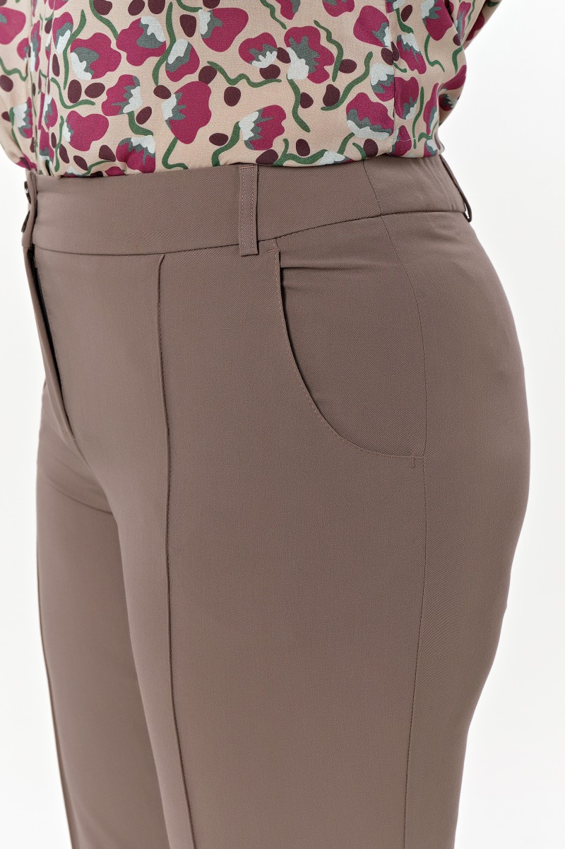 Брюки женские укороченные зауженные к низу на притачном фигурном поясе. На переде боковые функциональные карманы и «стрелки» настроченные по сгибу на 02 см. Застежка центральная на «молнию» и 2 выметанные петли и пуговицы на поясе. Посадка средняя. С