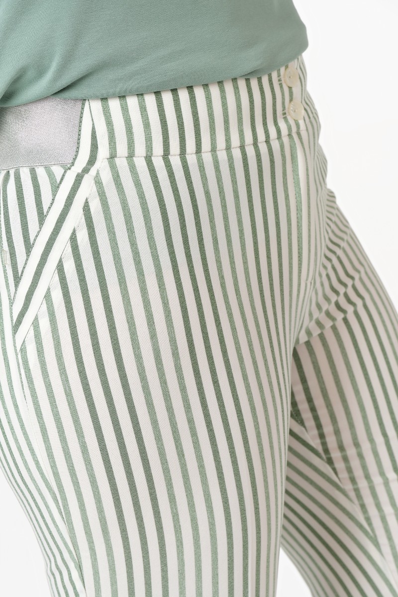 Брюки классические со «стрелками». Пояс комбинированный: по спинке и переду – текстиль со стороны бока – декоративная резинка. Застежка на переде центральная на «молнию» и две пуговицы. На переде наклонные бочки с декоративными листочками.