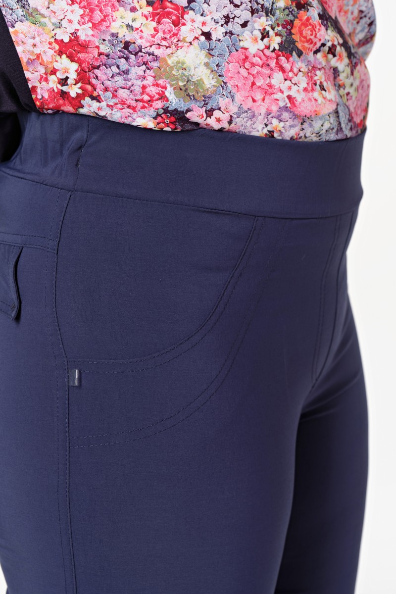 Брюки спортивного стиля плотно облегающие зауженные к низу с высокой комфортной посадкой. Верх брюк обработан притачным поясом с вложенной эластичной тесьмой-резиной. На переде бочки настроченные отделочной строчкой и имитация застежки «гульфик» задн