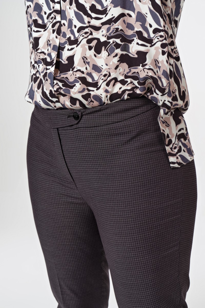 Брюки женские повседневные/ со средней посадкой/ с заутюженными сгибами (стрелками)/ с цельнокроеной манжетой по низу/ на притачном фигурном поясе/ концы которого застёгиваются на обмётанную петлю и пуговицу.Передние половины брюк с застежкой по типу «гуль
