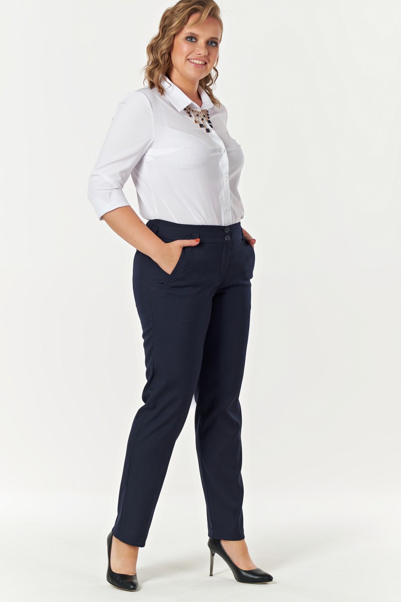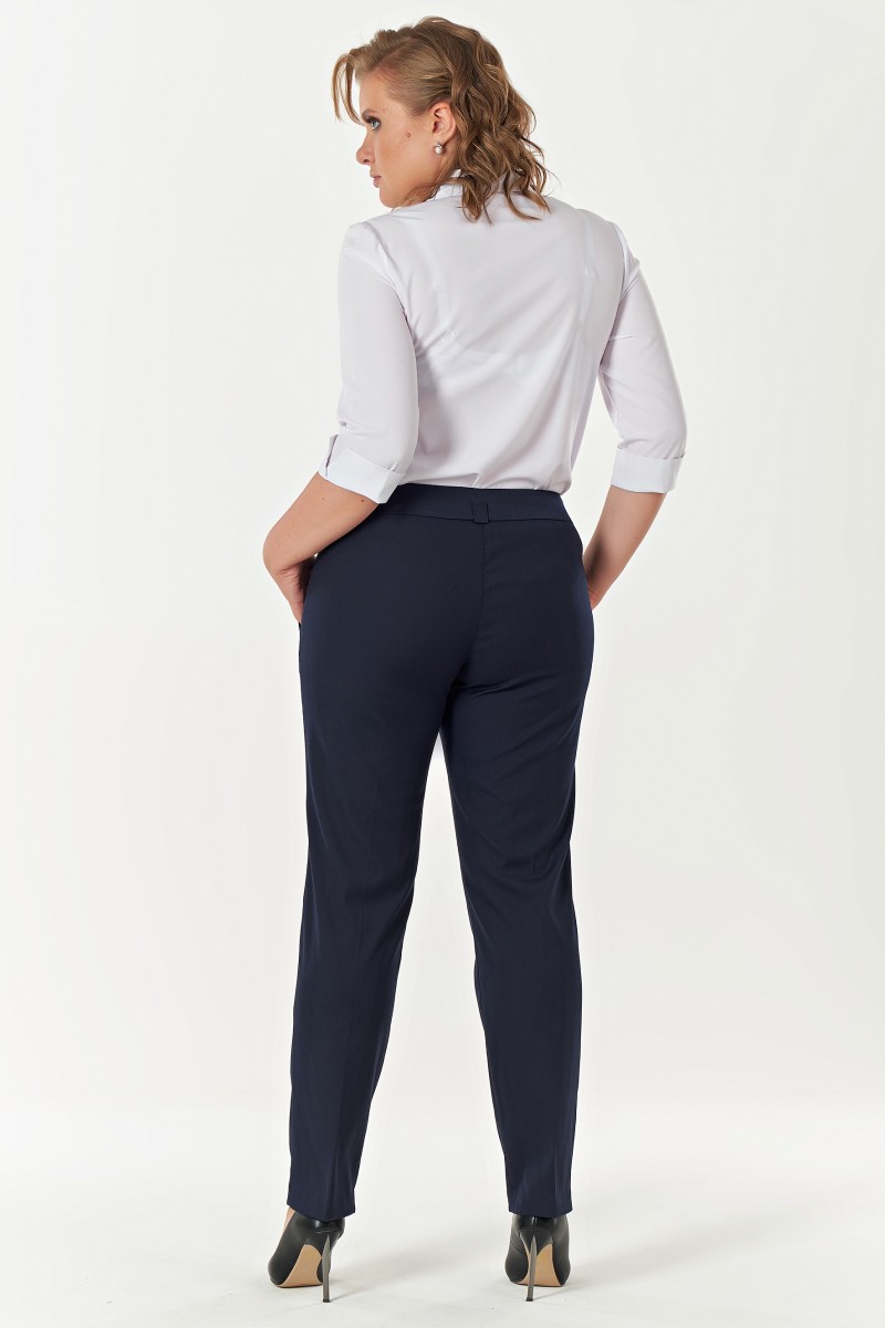 Брюки зауженные к низу со «стрелками» на притачном поясе-кокетке. Пояс с 5 шлевками в которые вставлен кожаный ремень. Посадка средняя. На переде брюк боковые карманы с листочками. По шву притачивания листочек проложена отделочная двойная строчка. Заст