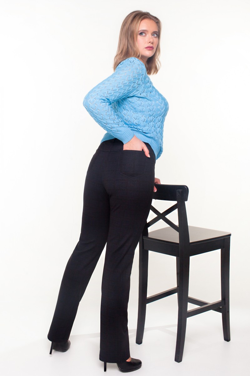 Брюки из плотного трикотажа прямые с высокой посадкой. В пояс вставлена эластичная резина обеспечивающая комфортную посадку по фигуре с центральной застежкой на «молнию» и 1 пуговицу и выметанную петлю. Передние половинки брюк оформлены имитацией боковы