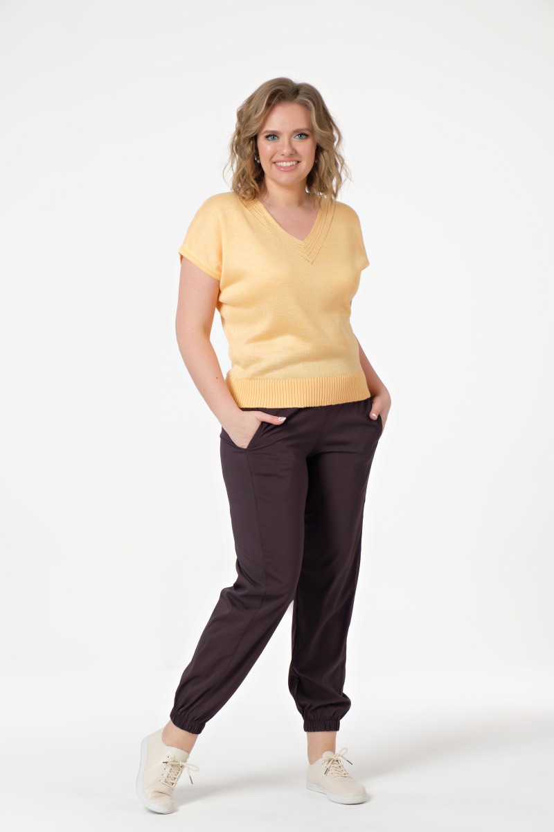 Брюки свободного силуэта с боковыми карманами. Внизу брюки собраны на эластичную тесьму.