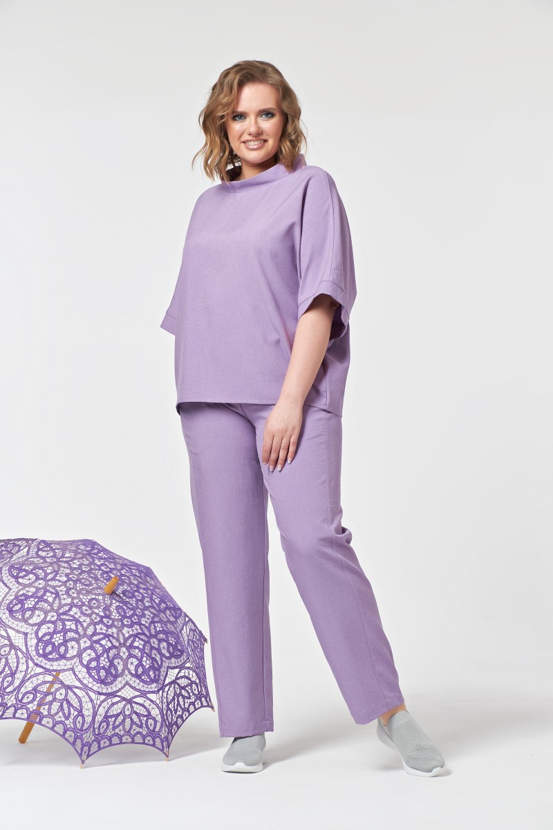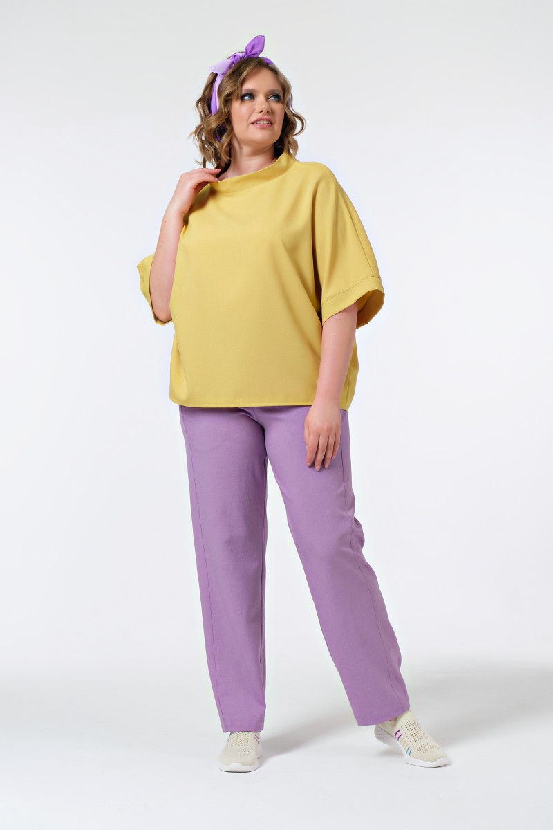 Брюки свободного силуэта слегка заужены книзу. Притачной пояс собран на эластичную тесьму. Сбоку широкая однотонная полоска в виде лампаса. Карманы в боковых швах.