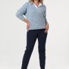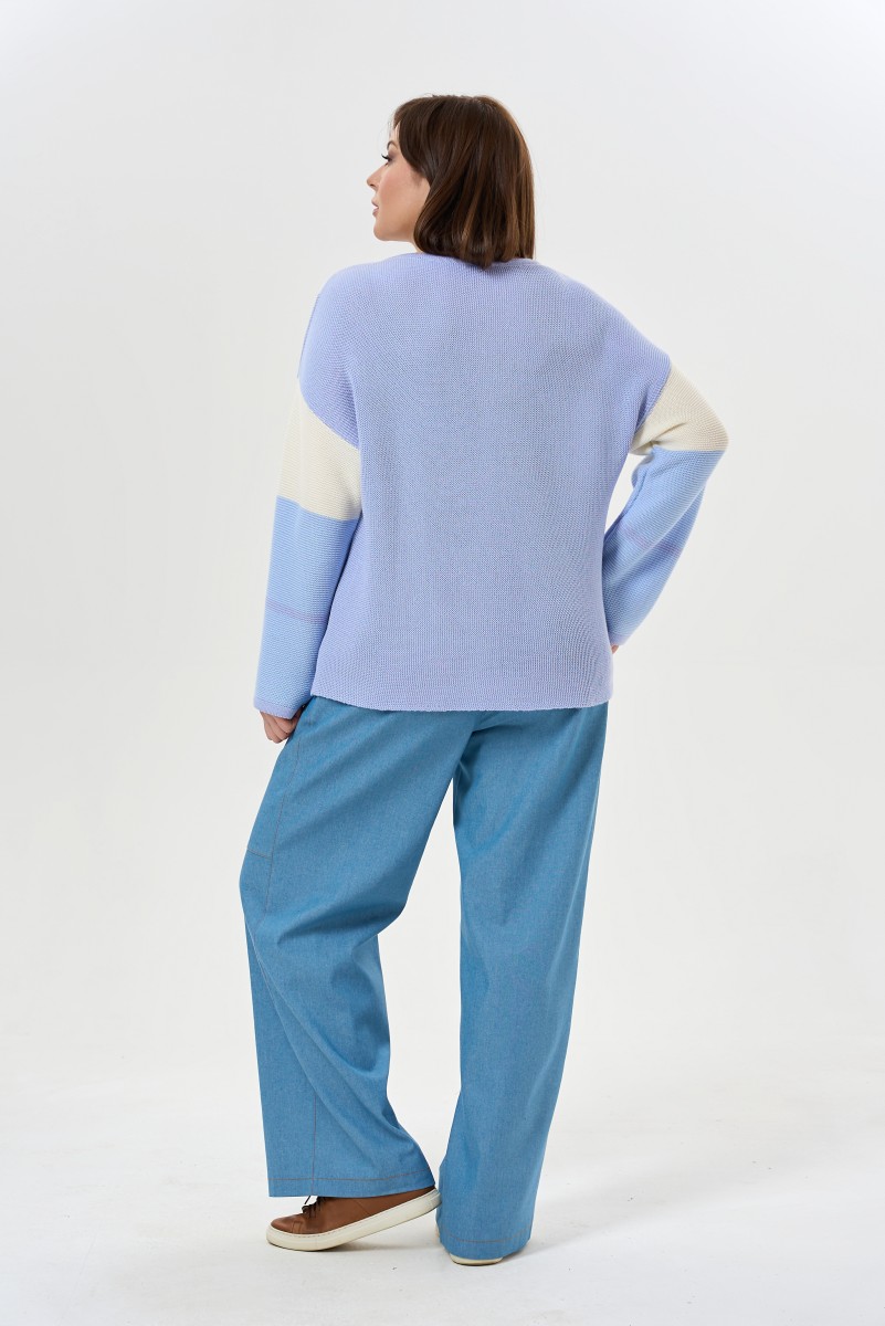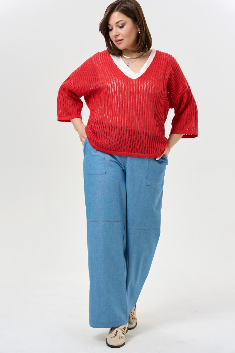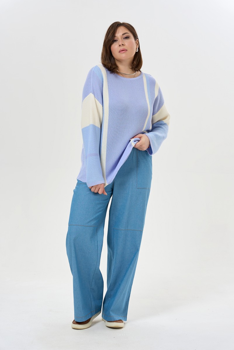 Брюки джинсовые широкие прямые с накладными карманами. Горизонтальный подрез выше линии колена с контрасной отстрочкой делает модель интересной. Пояс притачной на резинке без застежки.