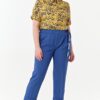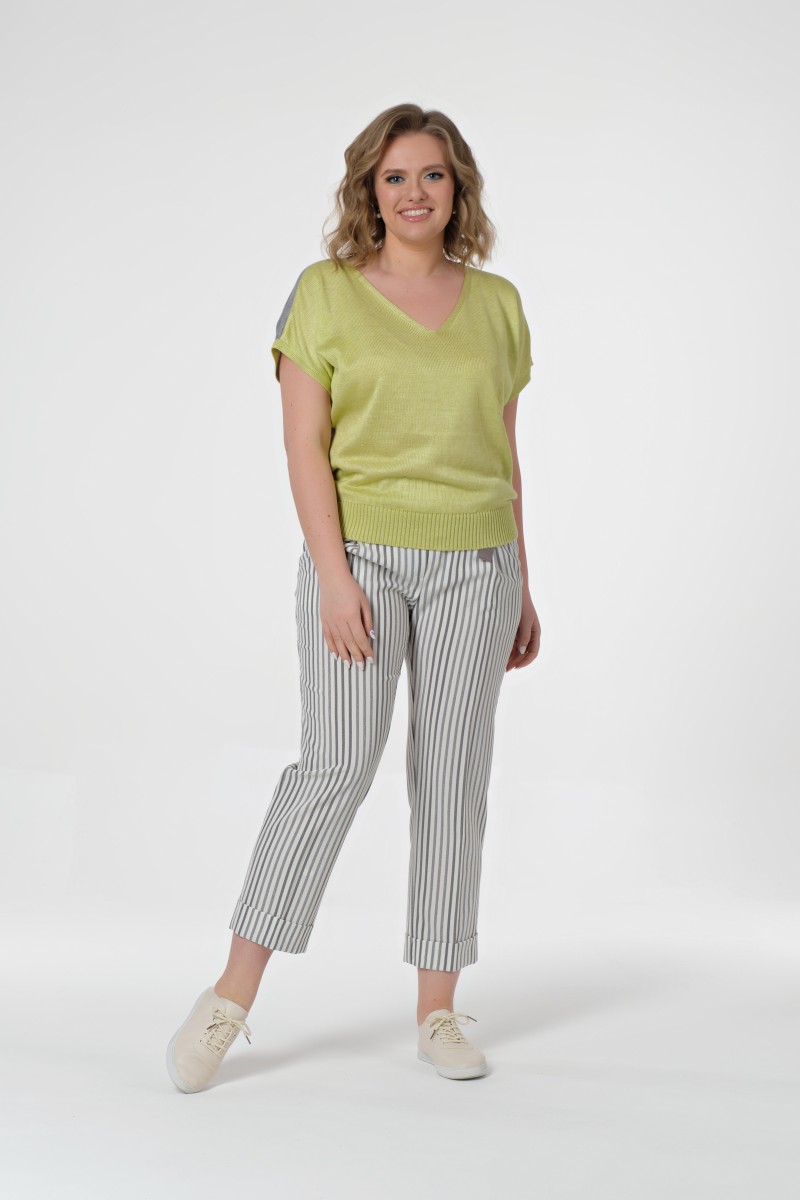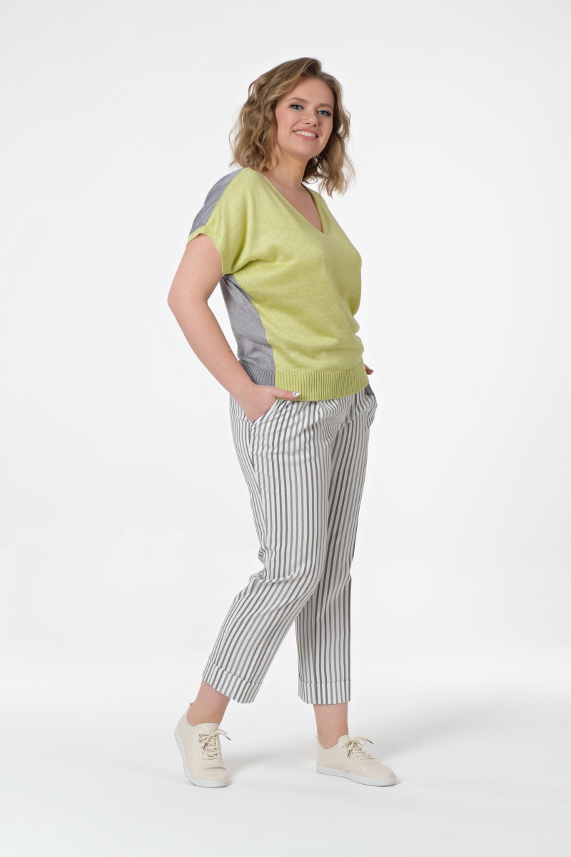Брюки свободного силуэта с функциональными карманами слегка укороченные. Пояс притачной с резинкой в пояс вставлена декоративная лента завязывающаяся сбоку. Низ брюк с цельнокроеной манжетой.