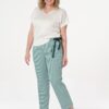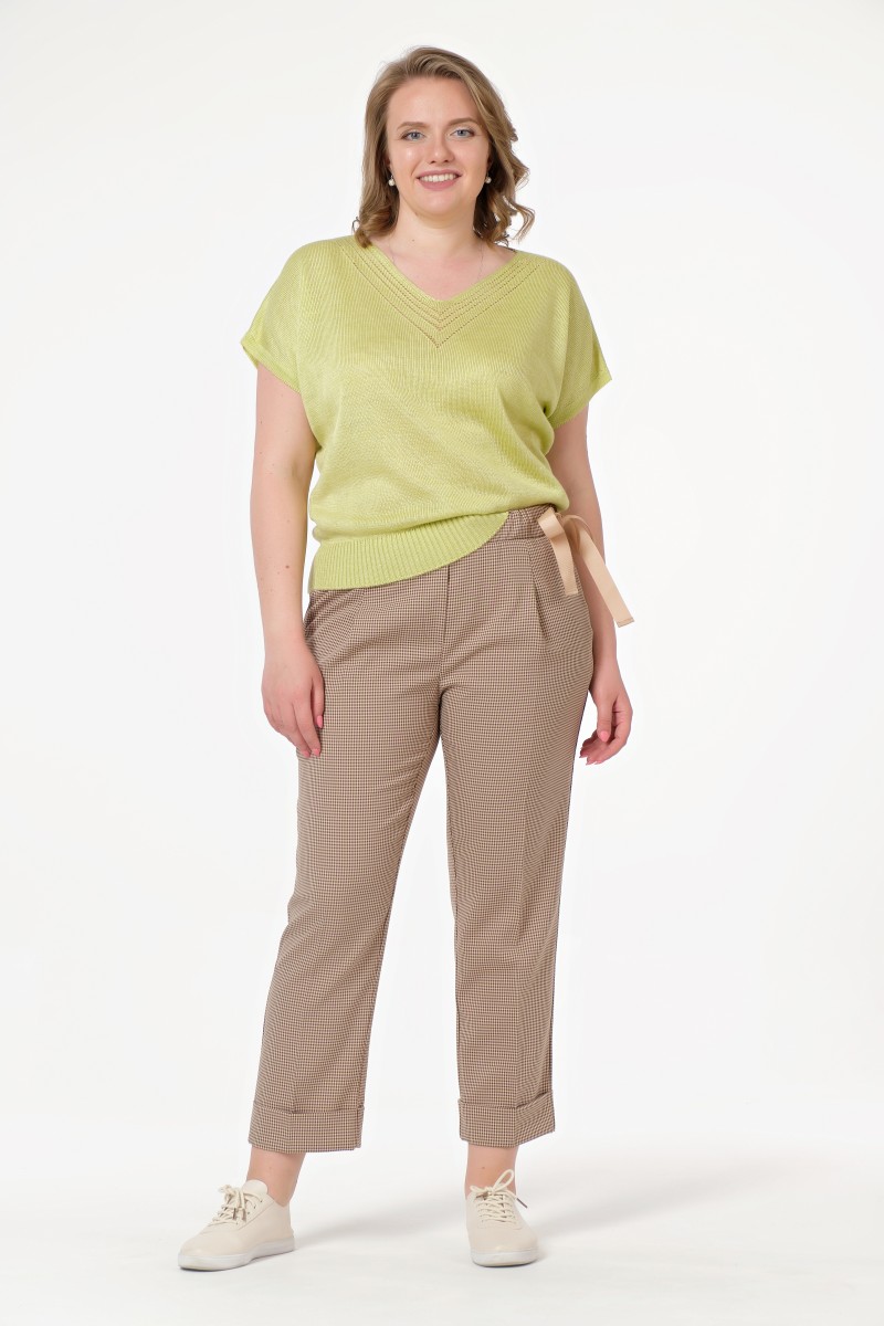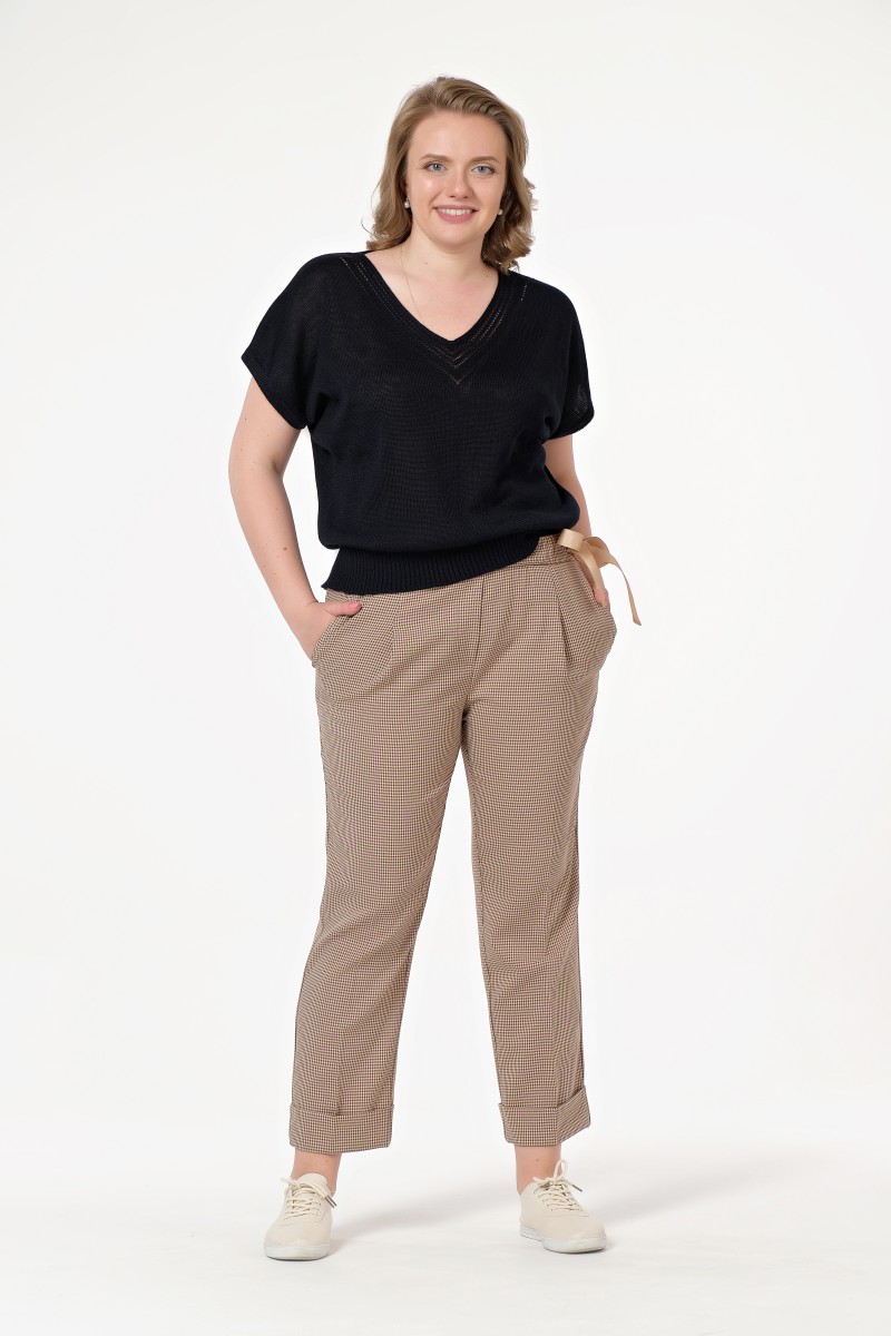 Брюки свободного силуэта с функциональными карманами слегка укороченные. Пояс притачной с резинкой в пояс вставлена декоративная лента завязывающаяся сбоку. Низ брюк с цельнокроеной манжетой.