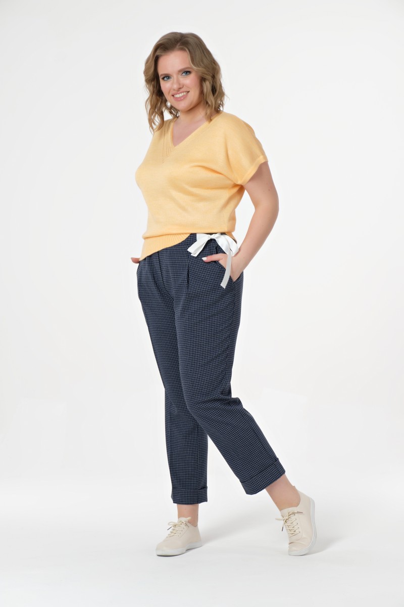Брюки свободного силуэта с функциональными карманами слегка укороченные. Пояс притачной с резинкой в пояс вставлена декоративная лента завязывающаяся сбоку. Низ брюк с цельнокроеной манжетой.