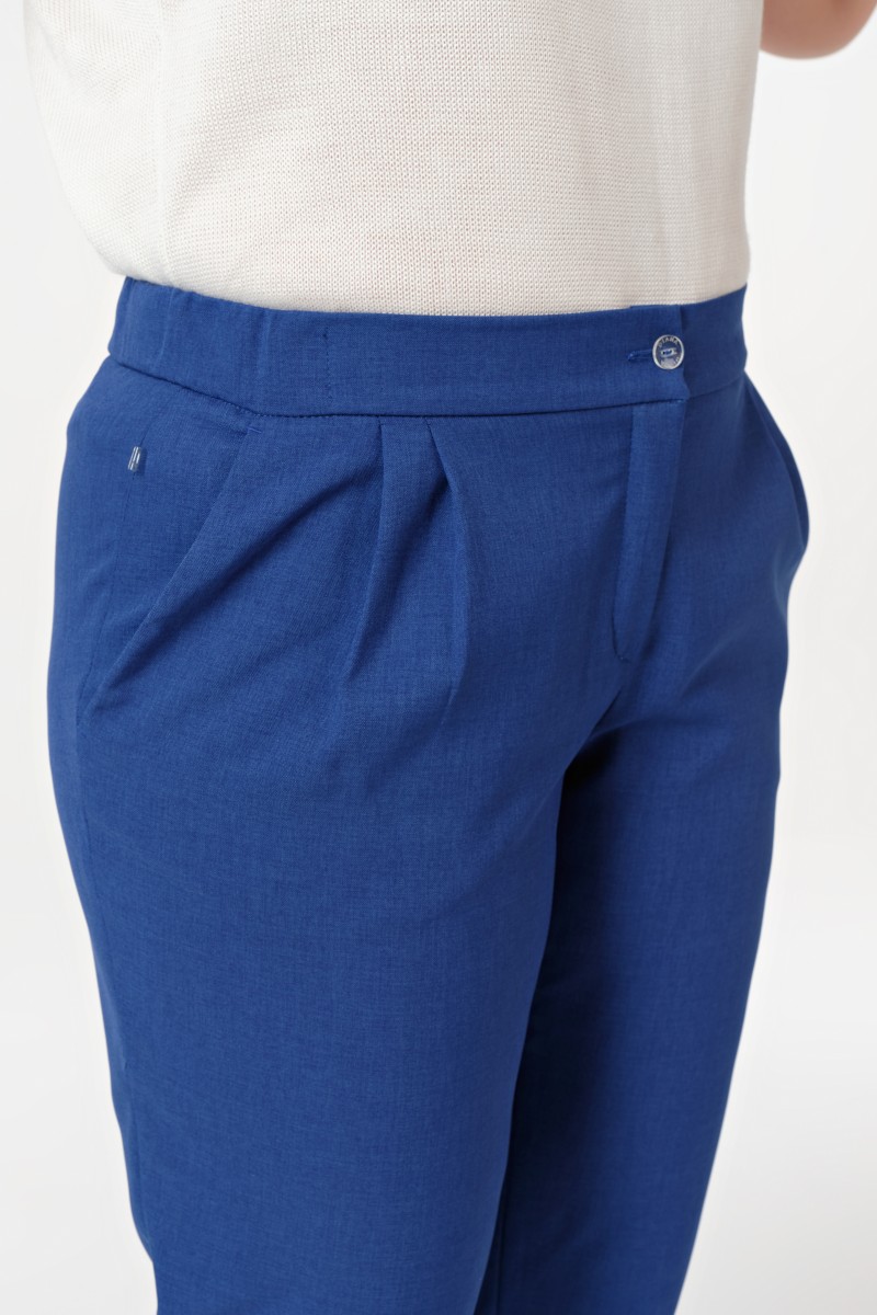 Брюки классические зауженные к низу с высокой посадкой на притачном поясе средней ширины. В заднюю часть пояса вставлена эластичная резина обеспечивающая комфортное прилегание по талии. Центральная застежка на «молнию» и 2 пуговицы и петли на поясе
