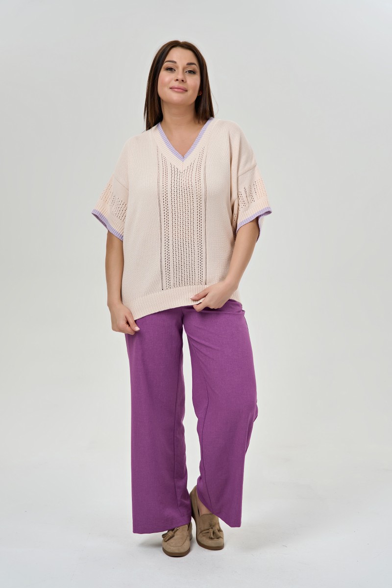 Брюки женские со средней посадкой прямые по всей длине на притачном поясе с резиной. Передние половины брюк с карманами в отрезных бочках с прямым оформлением входа в карман. Задние половины брюк – без особенностей. Размеры задвоены: 46-48; 50-52; 54-56; 58-60.