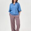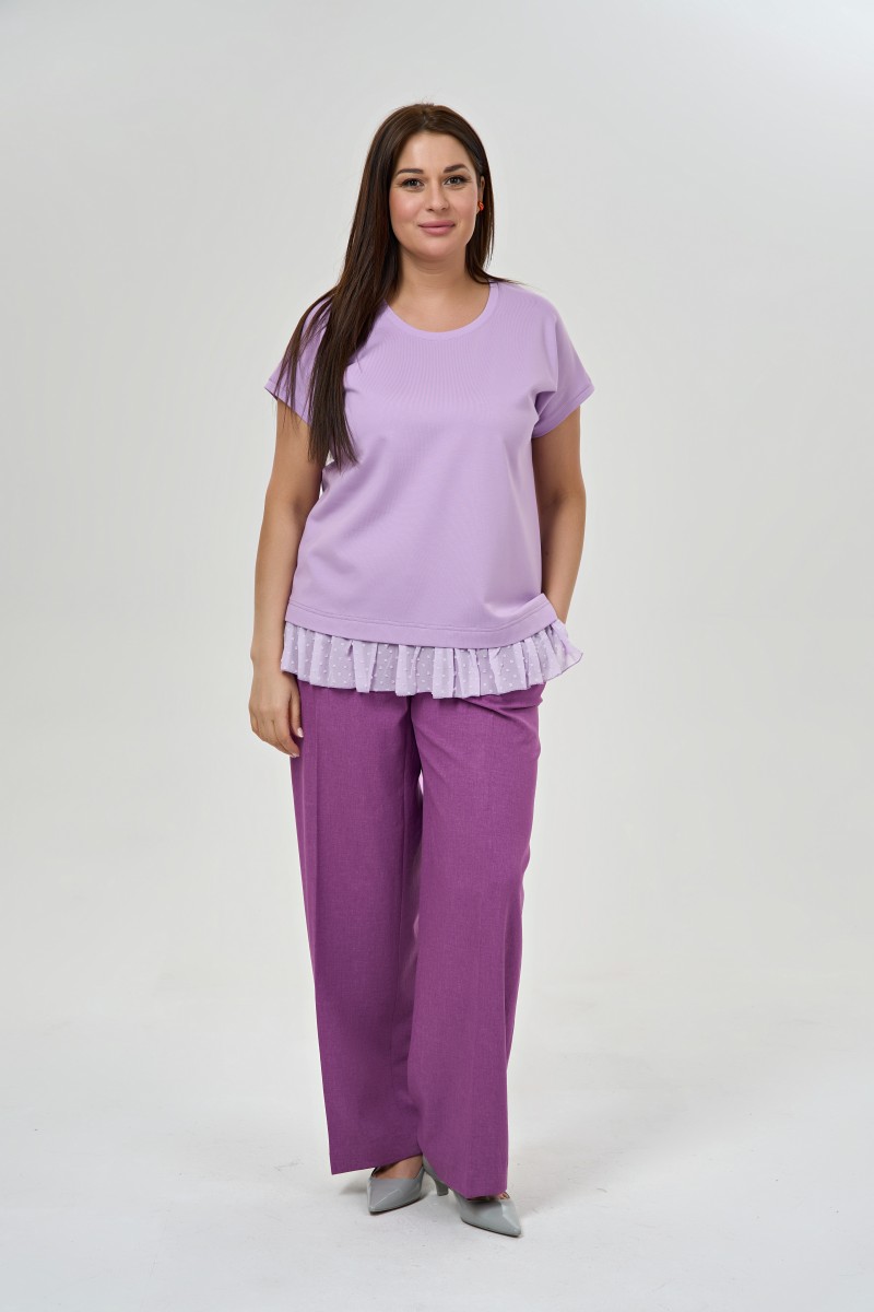 Брюки женские прямого силуэта форма “”Трубы””.Тип посадки классический застежка по центру на тесьму – молния с гульфиком. По переду боковые карманы. Пояс притачной подкрайной по спинке с резиновой тесьмой застегивается на 2 пробивных петли и 2 пуговицы. По поясу 3 широкие шлевки. По передним и задним половинкам брюк заутюженные стрелки.